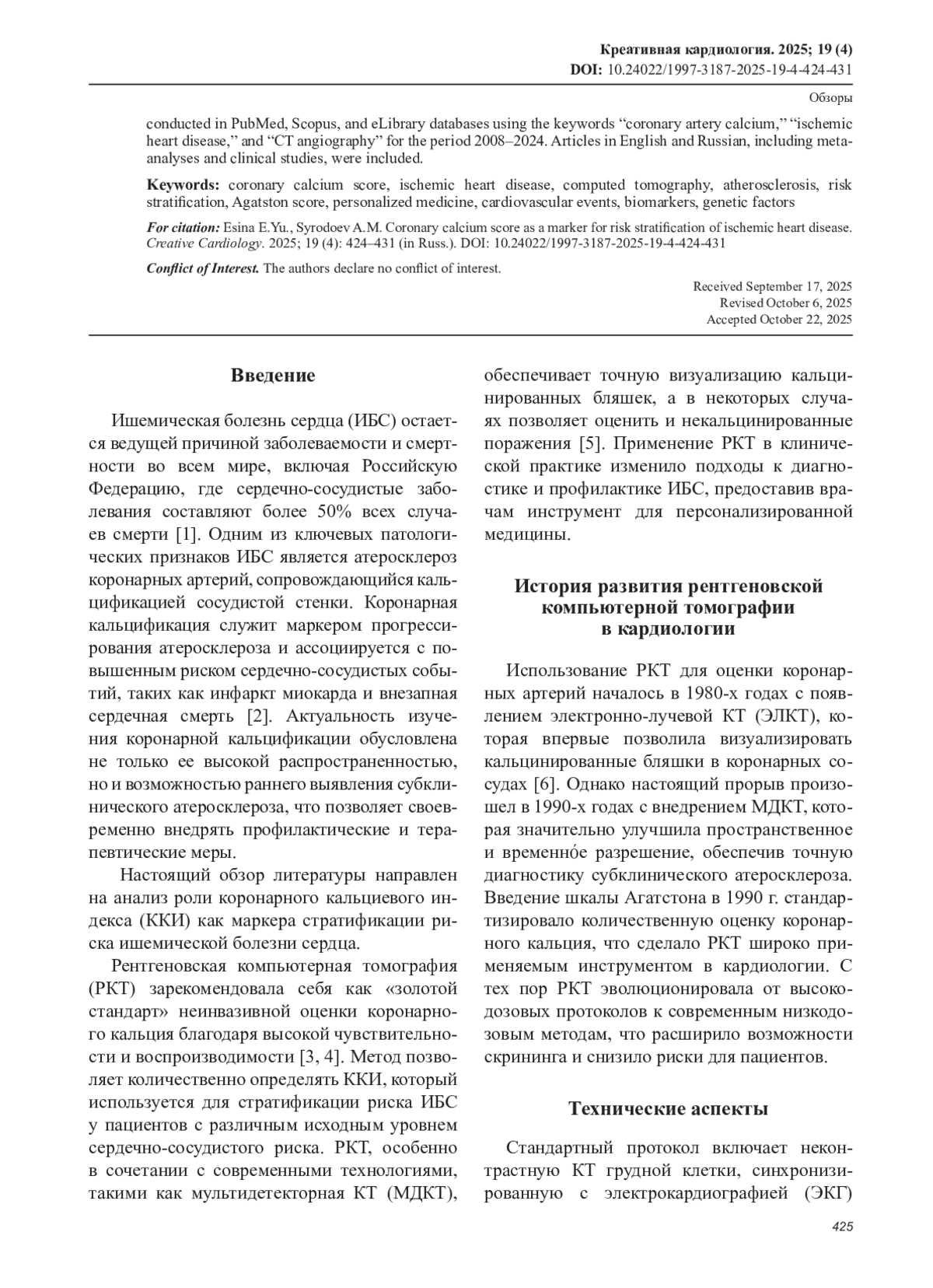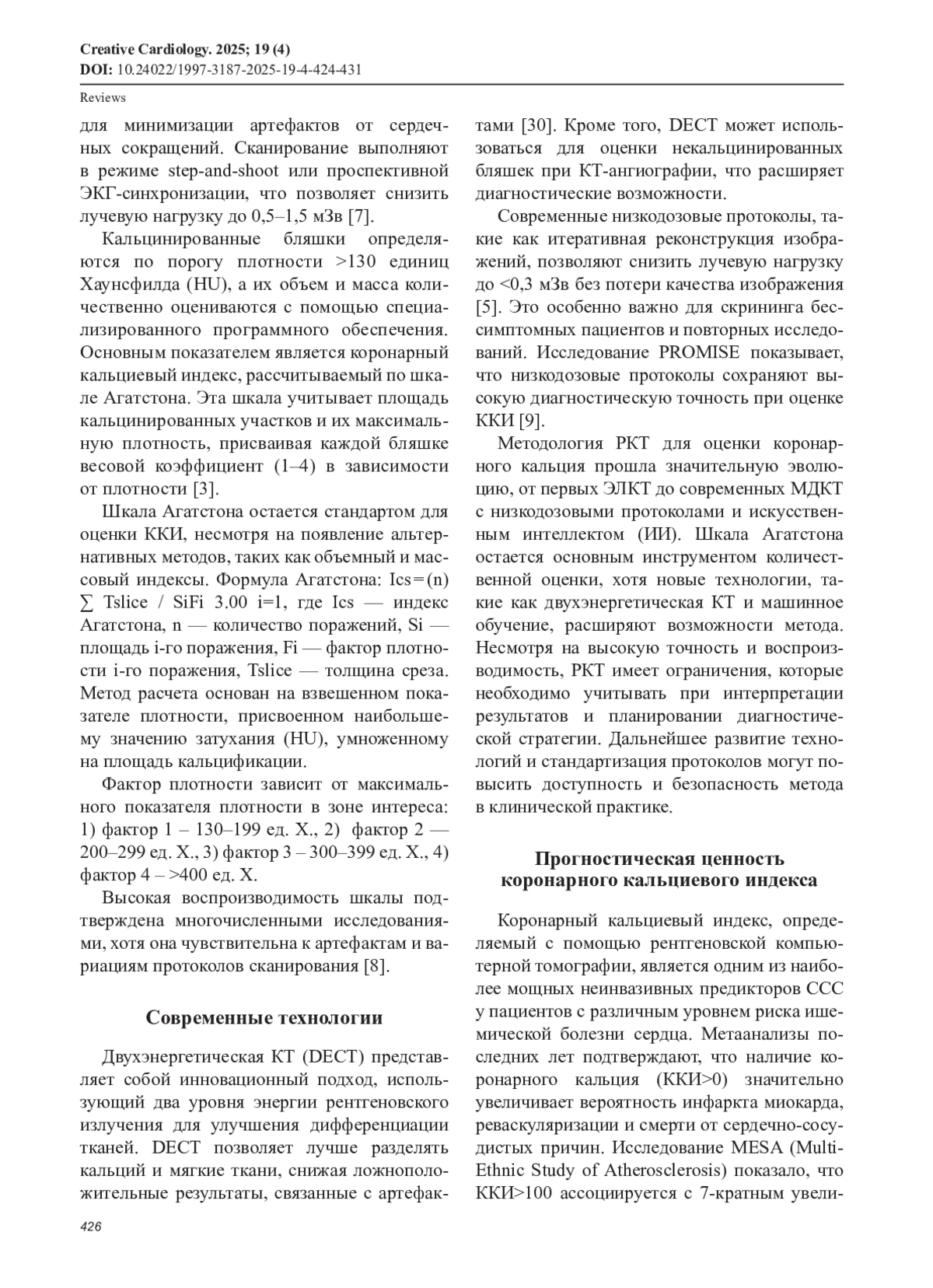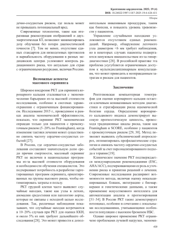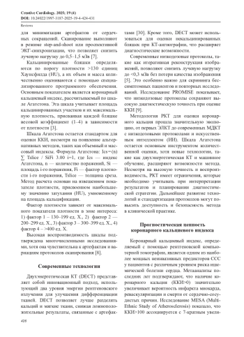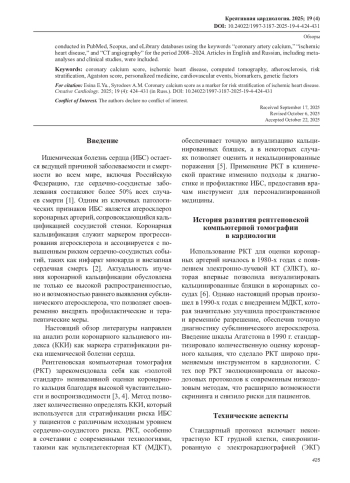 Обзор литературы посвящен роли коронарного кальциевого индекса (ККИ) как маркера стратификации риска ишемической болезни сердца (ИБС). ККИ, определяемый с помощью рентгеновской компьютерной томографии (РКТ) по шкале Агатстона, превосходит традиционные шкалы риска (Framingham, SCORE) в выявлении субклинического атеросклероза, особенно у пациентов с промежуточным риском. Исследования, включая MESA и PROMISE, показывают, что ККИ>100 ассоциирован с 7-кратным увеличением риска сердечно-сосудистых событий, тогда как ККИ=0 указывает на низкий риск (<0,1% годового риска). Современные низкодозовые протоколы (<0,3 мЗв) и двухэнергетическая КТ повышают безопасность и точность диагностики. КТ-ангиография выявляет некальцинированные бляшки, связанные с острым коронарным синдромом. Интеграция ККИ с биомаркерами (интерлейкины) и генетическими данными (локусы 9p21, SORT1) улучшает прогнозирование. Поиск литературы проводился в базах данных PubMed, Scopus и eLibrary с использованием ключевых слов «coronary artery calcium», «ischemic heart disease», «CT angiography» за период 2008–2024 гг. Включались статьи на английском и русском языках, метаанализы и клинические исследования.