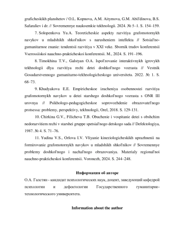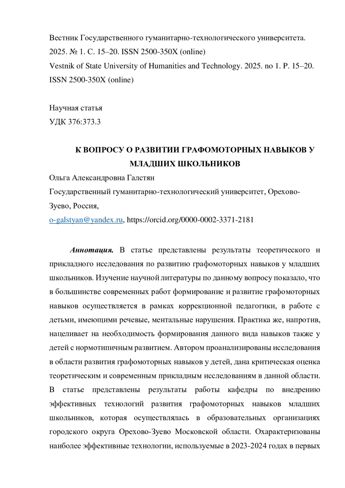2. Галстян О.А. Общее недоразвитие речи у дошкольников: синергетический подход // Вестник Государственного гуманитарно-технологического университета. 2024. № 1. С. 25-31. EDN: GODCOO