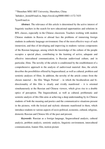 Актуальность представленной статьи определяется активным интересом преподавателей-лингвистов к поиску новых образовательных возможностей и решений на занятиях РКИ, особенно в китайской аудитории. Педагоги, работая с современными китайскими студентами в России или за границей, сталкиваются с проблемами погружения иностранных учащихся в аутентичную языковую среду. Одним из наиболее эффективных способов такого погружения, а значит, и развития, совершенствования у студентов различных составляющих русского языка, среди которых особое место занимает знание о культуре народа, способствующее обучению активной, адекватной и эффективной межкультурной коммуникации, является российская аудиовизуальная культура, и в частности, кинофильмы. Новизна статьи обусловлена установкой на комплексный подход к анализу аудиовизуального материала: так, в статье описываются возможности, которые предоставляет лингвокультурологический, а также культурологический, проблемный и семиотический анализ кинокартин. Кроме того, новизна статьи исходит из самого выбранного материала - фильма «Волшебный портрет», - в котором явно и ярко проявляет себя двукультурность, двунаправленность этого кино - ориентированность одновременно на русского и китайского зрителя, что порождает двойную оптику восприятия. Лингвокультурологический, а также культурологический, проблемный и семиотический анализ этого фильма направлен на достижение китайскими учащимися глубокого понимания как смысла и поэтики, так и присутствующих в картинах коммуникативных ситуаций, с проявленными в них лексическими и стилистическими элементами, которые знакомят студентов с различными аспектами общественно-политической, экономической, культурной, религиозной, бытовой русской и китайской жизни прошлого и настоящего.