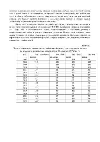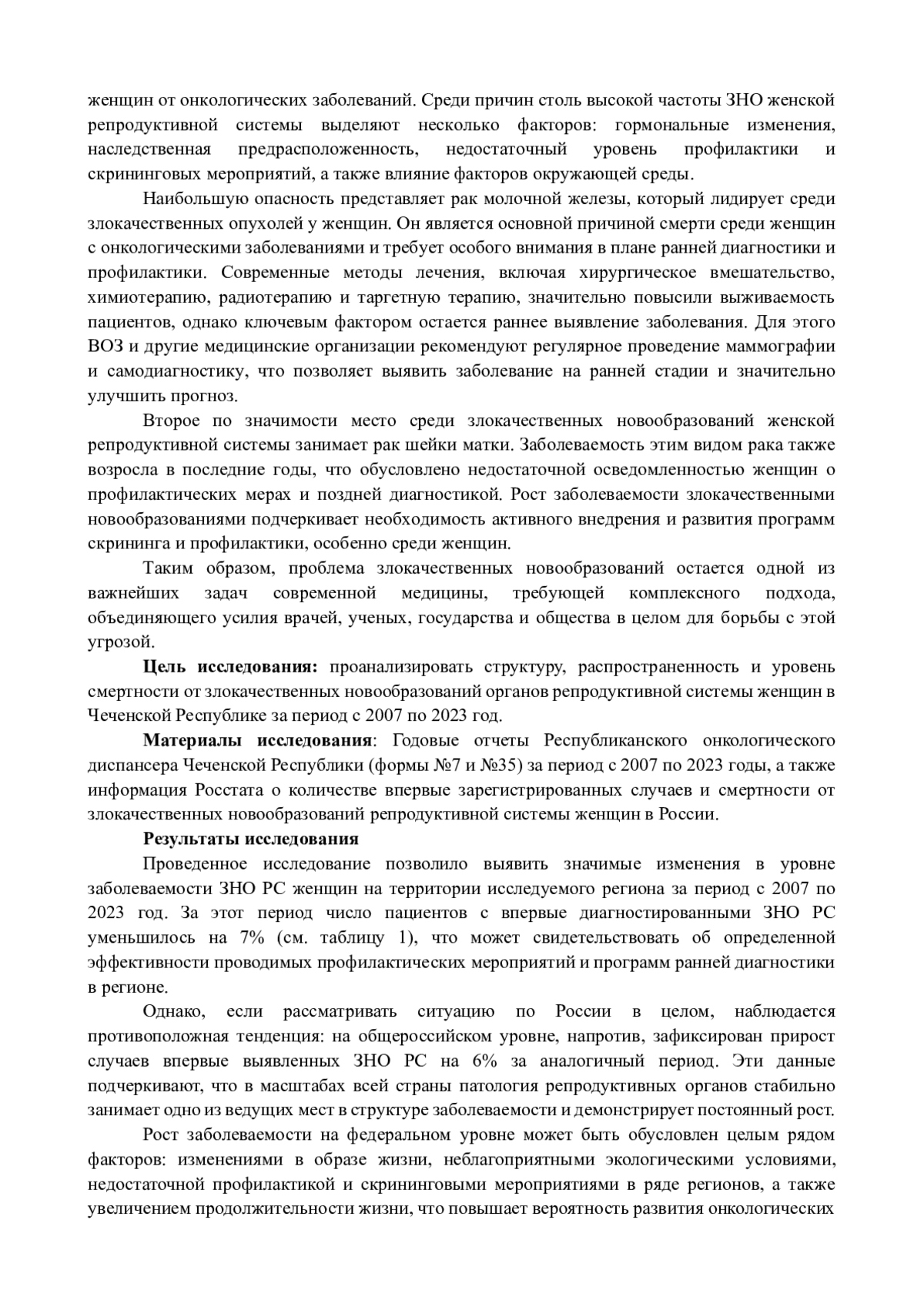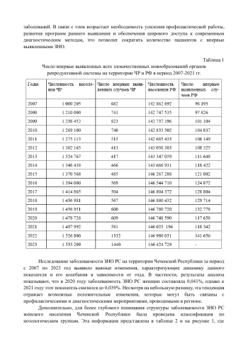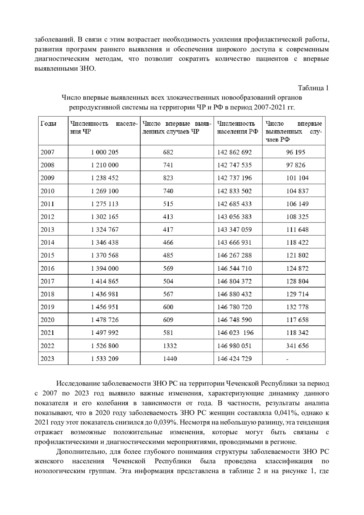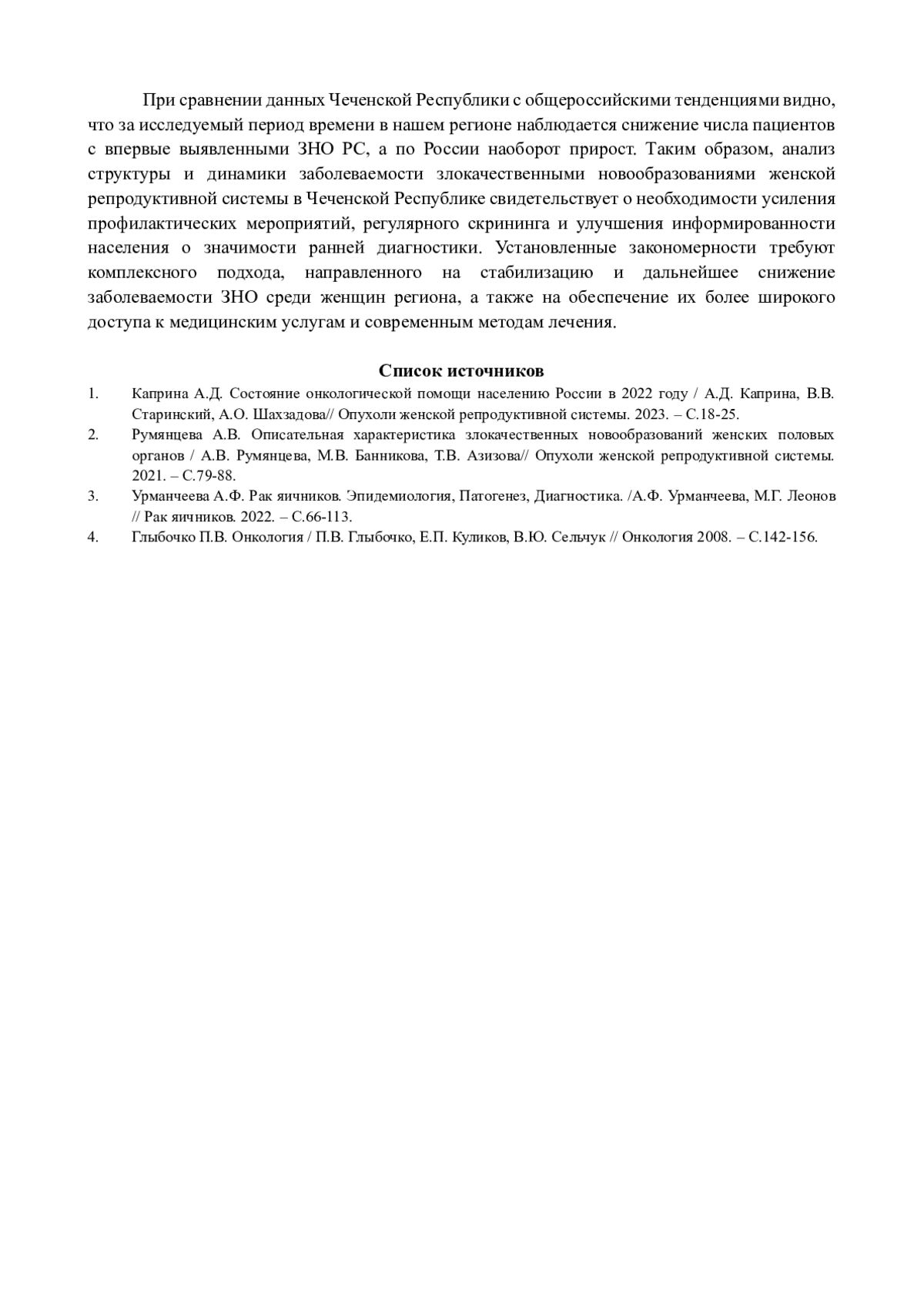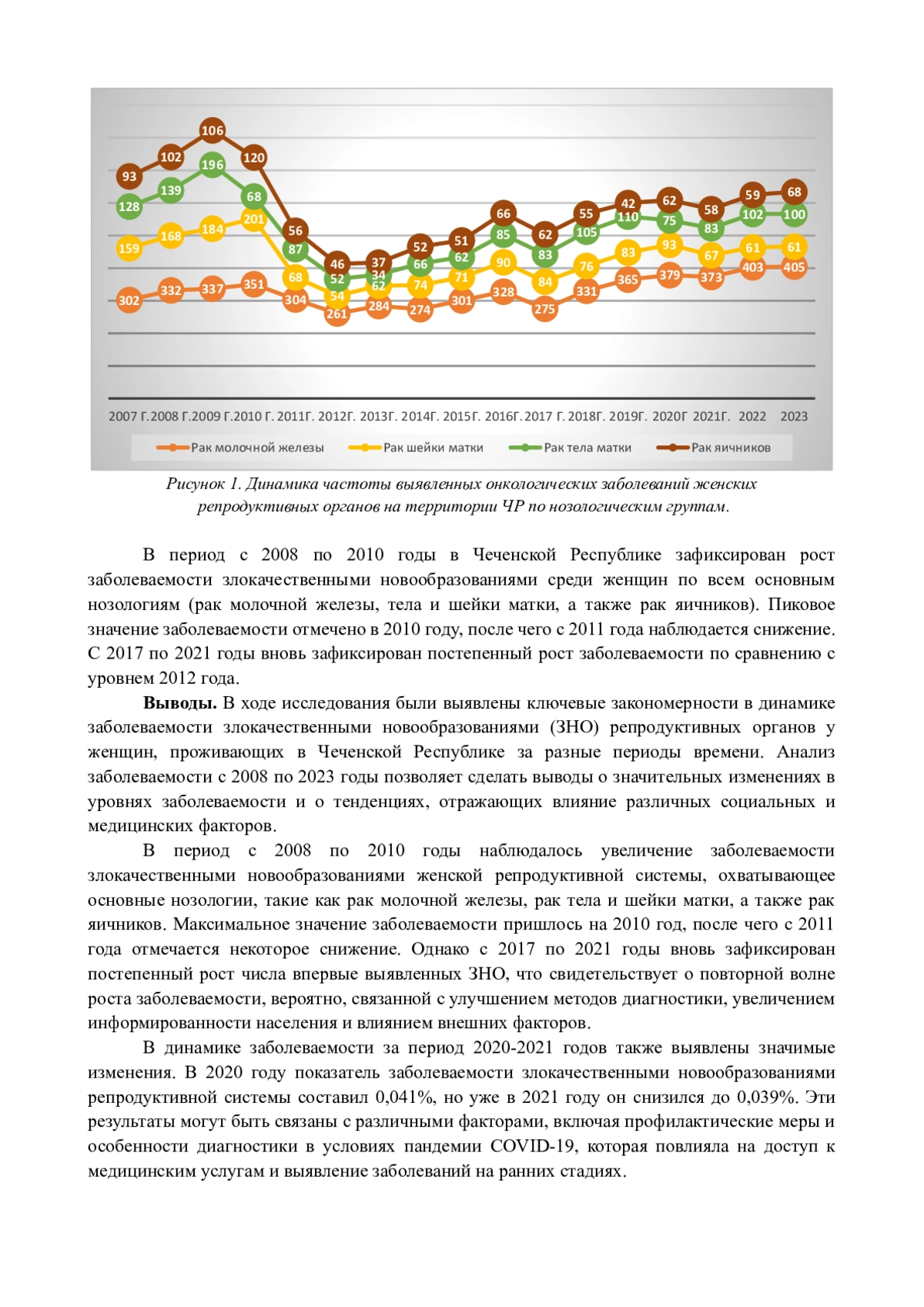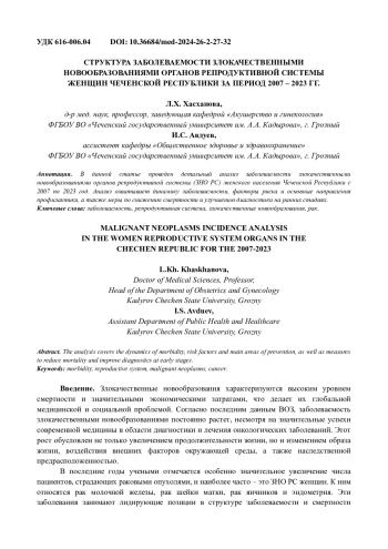 Статья: СТРУКТУРА ЗАБОЛЕВАЕМОСТИ ЗЛОКАЧЕСТВЕННЫМИ НОВООБРАЗОВАНИЯМИ ОРГАНОВ РЕПРОДУКТИВНОЙ СИСТЕМЫ ЖЕНЩИН ЧЕЧЕНСКОЙ РЕСПУБЛИКИ ЗА ПЕРИОД 2007 - 2023 ГГ (2024)