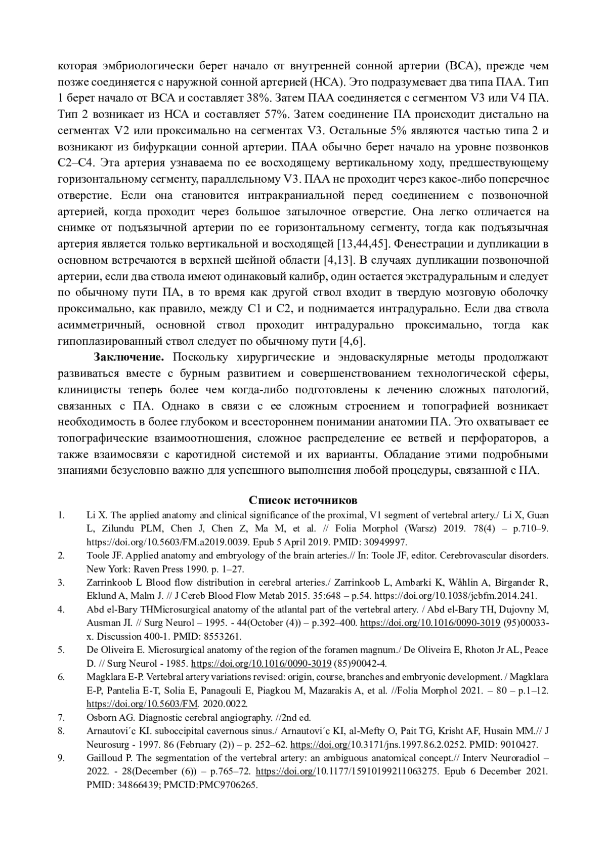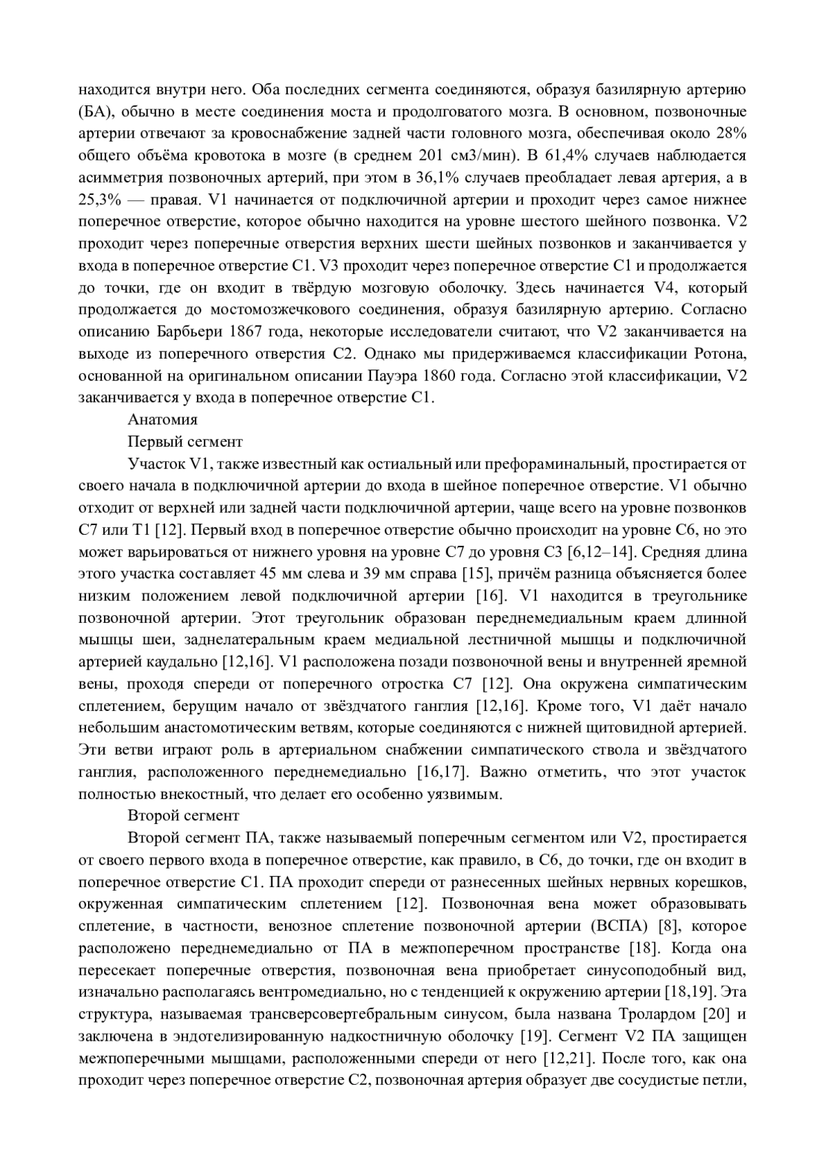 На основе анализа научных трудов (монографий, статей, диссертаций и авторефератов диссертаций) отечественных и зарубежных авторов за период с 1860 до 2023 г обобщены и систематизированы имеющиеся в литературе сведения об анатомии позвоночной артерии у взрослых людей. Представлены данные о топографических взаимоотношениях, распределении ее ветвей и перфораторов, а также взаимосвязях с каротидной системой и их вариантах.