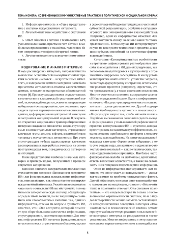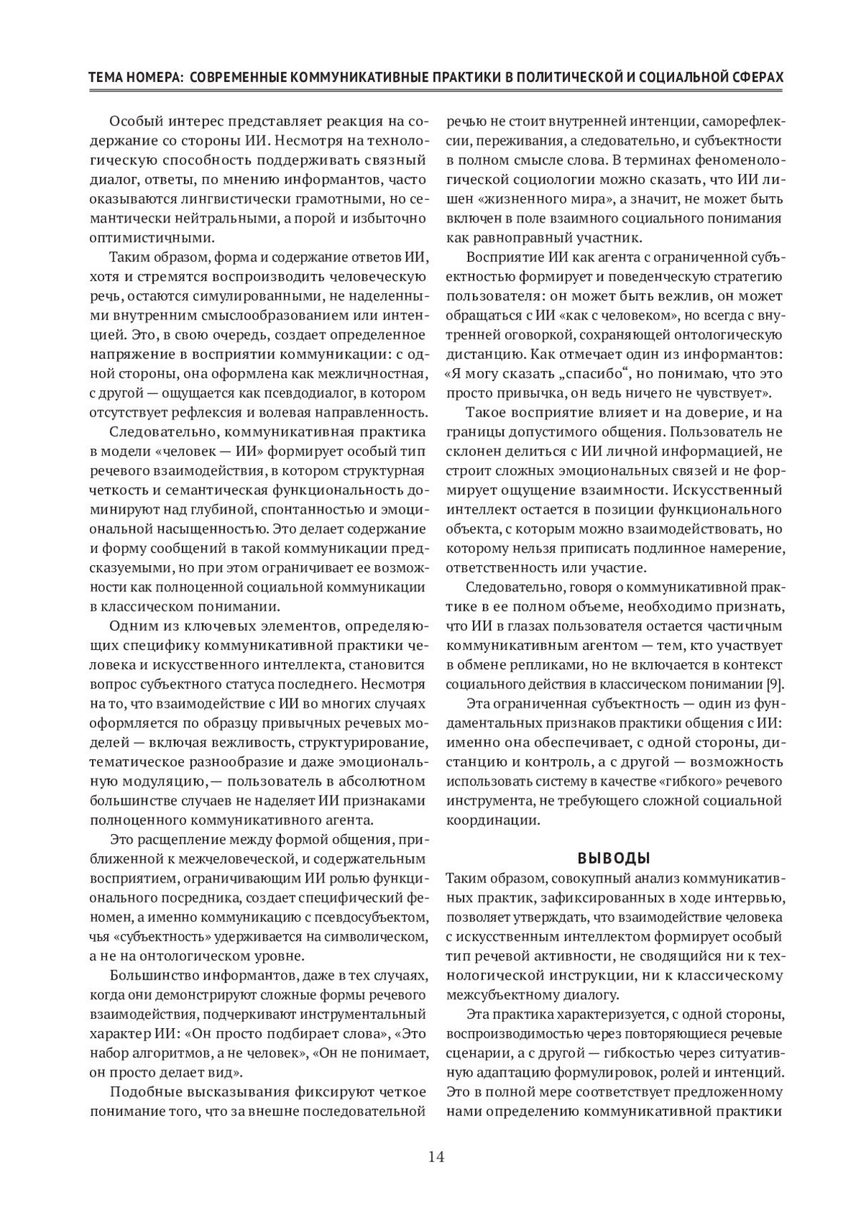 В статье анализируются коммуникативные практики, применяемые человеком в общении с искусственными коммуникативными системами. В центре внимания находится тот уникальный гибридный характер взаимодействия, который формируется на стыке человеческих ожиданий и алгоритмических ограничений. Авторы показывают, как традиционные модели общения трансформируются, адаптируясь к новым цифровым реалиям, где собеседник лишен субъектности в привычном понимании, но при этом провоцирует сложные и порой амбивалентные формы коммуникативного поведения. Эмпирической основой исследования послужили 24 полуструктурированных интервью, анализ которых проводился в соответствии с методологией обоснованной теории. Последовательное применение открытого, осевого и избирательного кодирования позволило авторам выйти за рамки простого описания речевых тактик и осуществить концептуализацию коммуникативной практики как особой формы социального действия. Сочетание глубокого эмпирического анализа с теоретической рамкой дало возможность раскрыть глубинные механизмы взаимодействия, включая мотивационные интенции пользователей, особенности символического восприятия искусственного интеллекта и весь спектр эмоционального отклика — от любопытства и восторга до разочарования и фрустрации. В результате исследования выявлены ключевые стратегии, к которым прибегают пользователи: от утилитарного уточнения запросов и ролевого программирования до эмоционально окрашенной вежливости и игрового экспериментирования. Показано, что внешне технологически опосредованная коммуникация внутренне воспроизводит и одновременно трансформирует человеческие модели общения, создавая новый синтез рационального и социального. Таким образом, коммуникация с искусственным интеллектом предстает не как упрощенный обмен командами, а как сложный, многомерный процесс постоянной адаптации, где человек выстраивает уникальные отношения с алгоритмически организованным партнером, занимающим позицию амбивалентного псевдосубъекта.