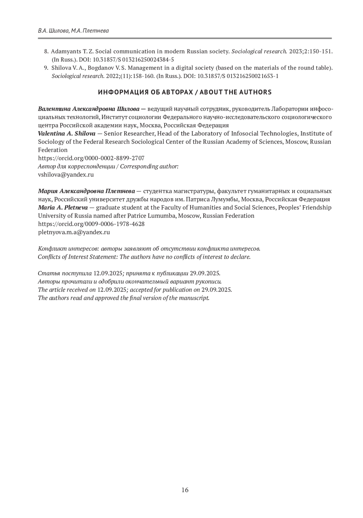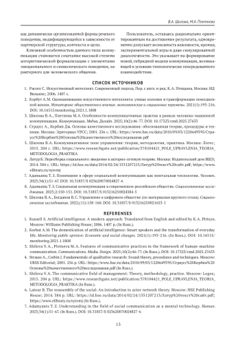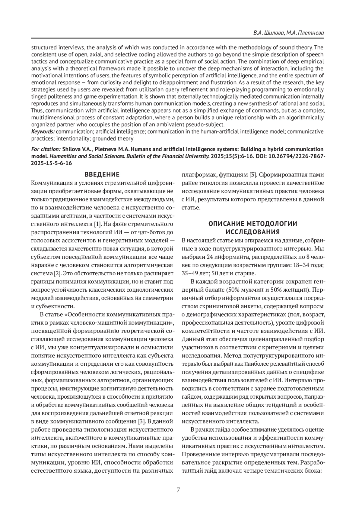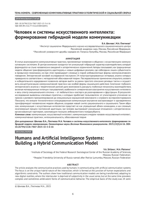 ШИЛОВА В. А., ПЛЕТНЕВА М. А. ЧЕЛОВЕК И СИСТЕМЫ ИСКУССТВЕННОГО ИНТЕЛЛЕКТА: ФОРМИРОВАНИЕ ГИБРИДНОЙ МОДЕЛИ КОММУНИКАЦИИ // ГУМАНИТАРНЫЕ НАУКИ. ВЕСТНИК ФИНАНСОВОГО УНИВЕРСИТЕТА. 2025. ТОМ 15, № 5