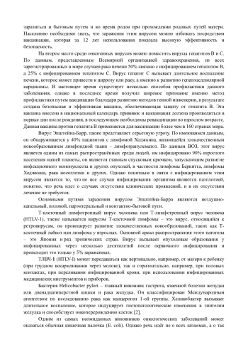 На второе место среди онкогенных вирусов можно поместить вирусы гепатитов В и С. По данным, представленным Всемирной организацией здравоохранения, из всех зарегистрированных в мире случаев рака печени 50% связано с инфицированием гепатитом В, а 25% с инфицированием гепатитом С. Вирус гепатит С вызывает длительное воспаление печени, которое может привести к циррозу или раку, а именно к развитию гепатоцеллюлярной карциномы. В настоящее время существует несколько способов профилактики данного заболевания, однако в последнее время получил широкое признание именно метод профилактики путем вакцинации благодаря развитию методов генной инженерии, в результате создана безопасная и эффективная вакцина, обеспечивающая защиту от гепатита В. Эта вакцина внесена в национальный календарь прививок и вакцинация должна производиться в первые дни после рождения, в последующем необходимы ревакцинации во взрослом возрасте. Данная вакцина против гепатита В применяется для вакцинации более чем в 160 странах мира.