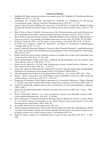 21. Takayuki Shimpoh, Yoshihiro Hirata, Sozaburo Ihara, Nobumi Suzuki, Hiroto Kinoshita, Yoku Hayakawa, Yumiko Ota, Akiko Narita, Shuntaro Yoshida, Atsuo Yamada, Kazuhiko Koike Prevalence of pks-positive Escherichia coli in Japanese patients with or without colorectal cancer // Gut Pathogens (2017) 9:35.