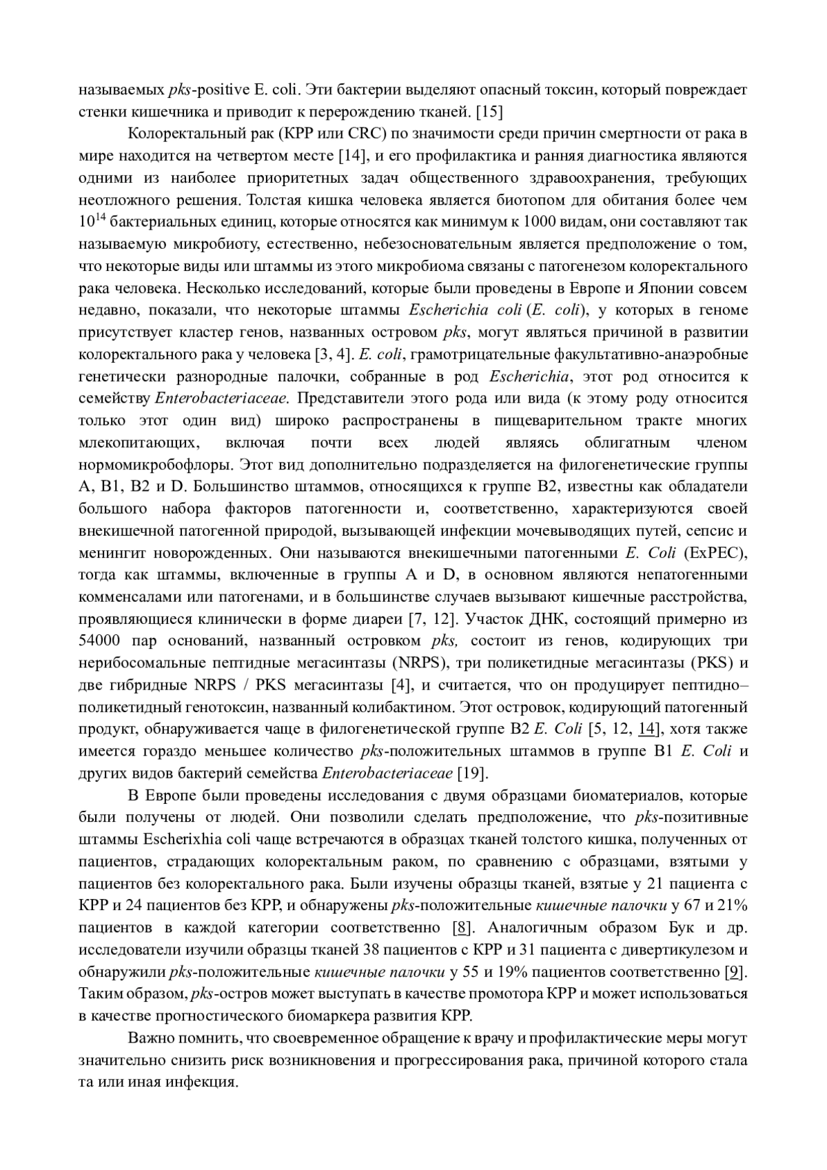 Существуют патогенные виды микроорганизмов разных видов, такие как вирус папилломы человека (HPV), вирус Эпштейна-Барр, Т-клеточный лимфотропный вирус человека, бактерия Helicobacter pylori и другие, способные провоцировать развитие у человека онкологических новообразований. Недавно обнаружена связь некоторых штаммов кишечных палочек с развитием колоректального рака. Колоректальный рак (КРР или CRC) по значимости среди причин смертности от рака в мире находится на четвертом месте [14], и его профилактика и ранняя диагностика является одной из наиболее приоритетных задач общественного здравоохранения, требующей неотложного решения.