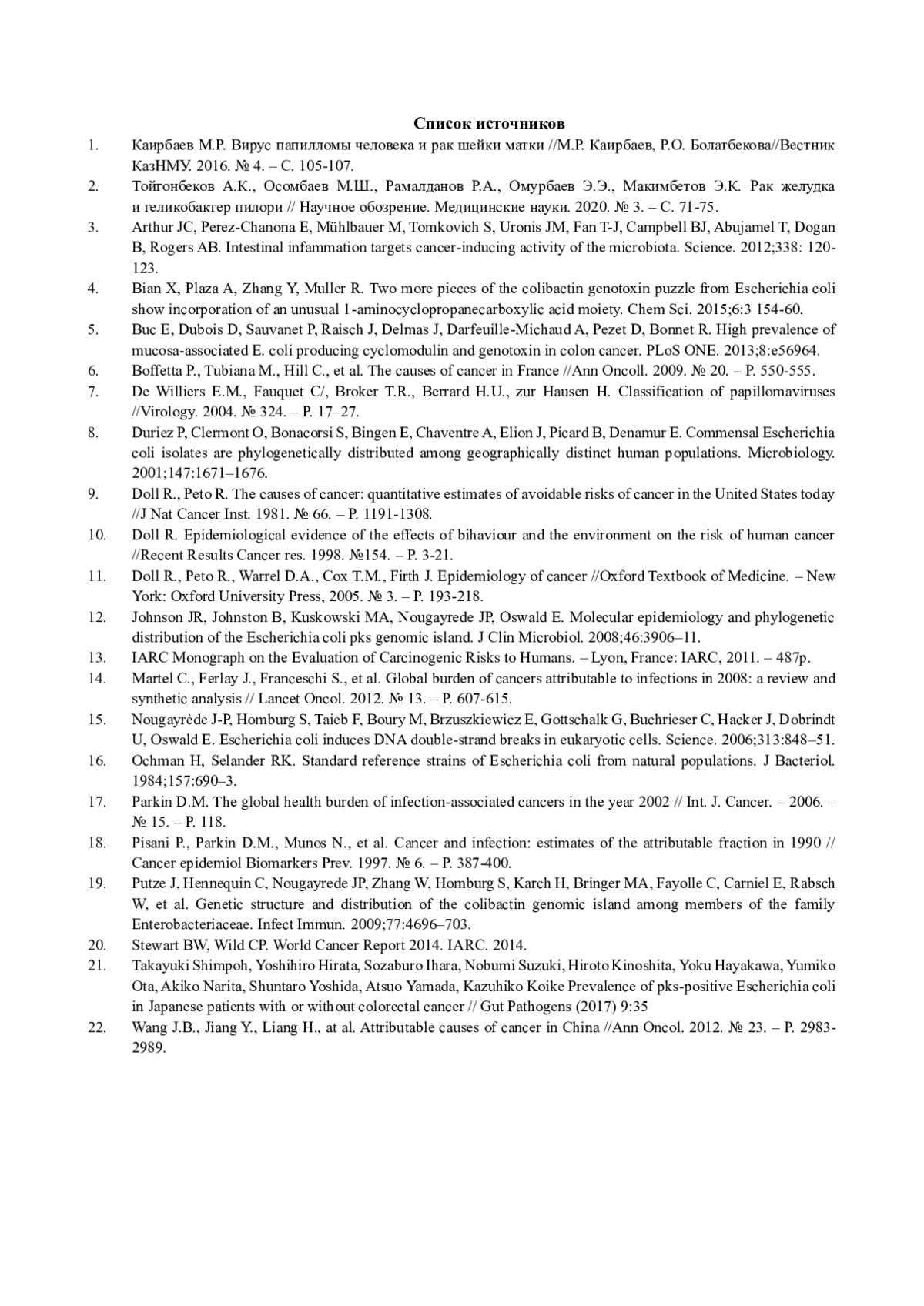 1. Каирбаев М.Р. Вирус папилломы человека и рак шейки матки //М.Р. Каирбаев, Р.О. Болатбекова//Вестник КазНМУ. 2016. № 4. - С. 105-107. EDN: YOEULE