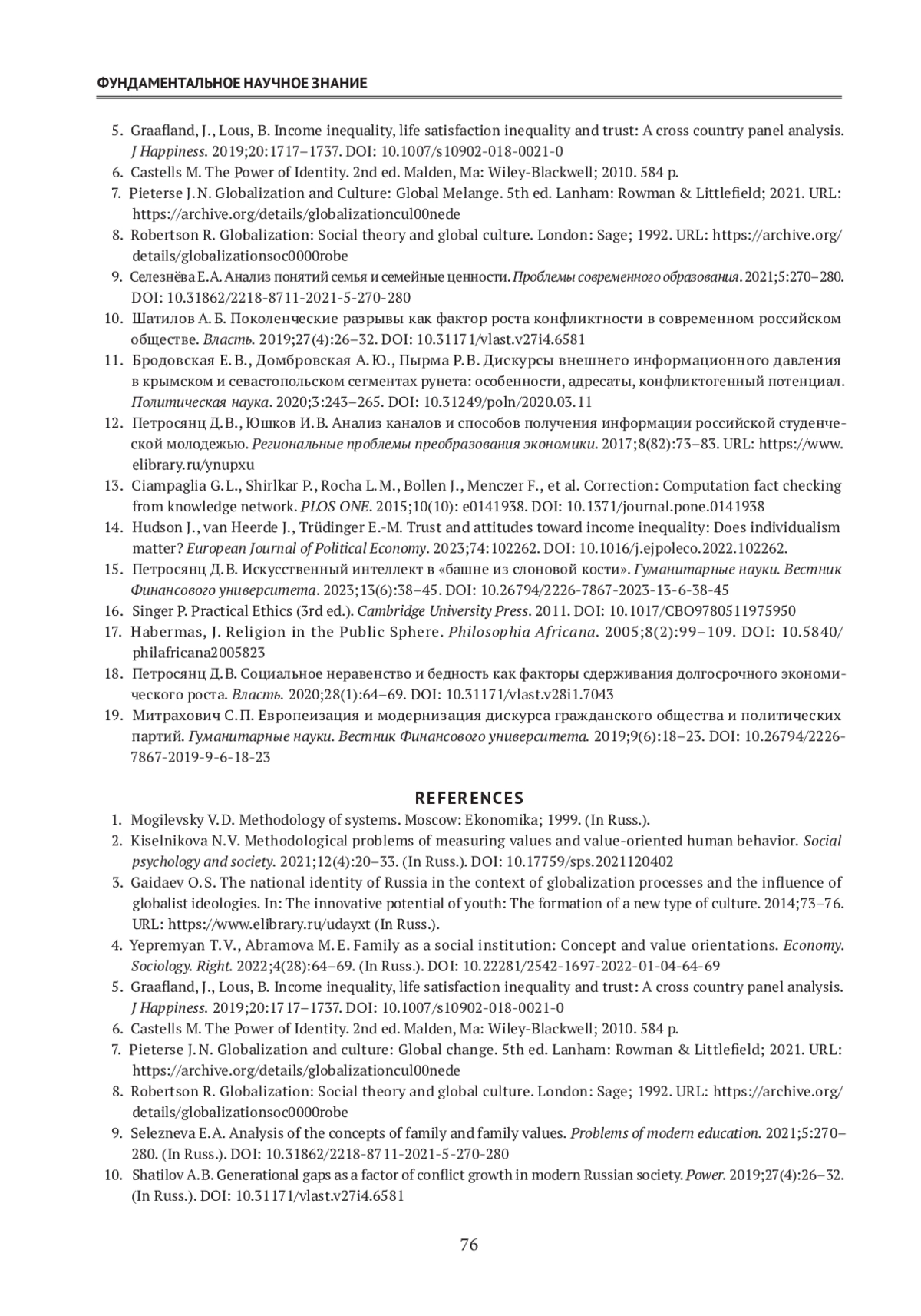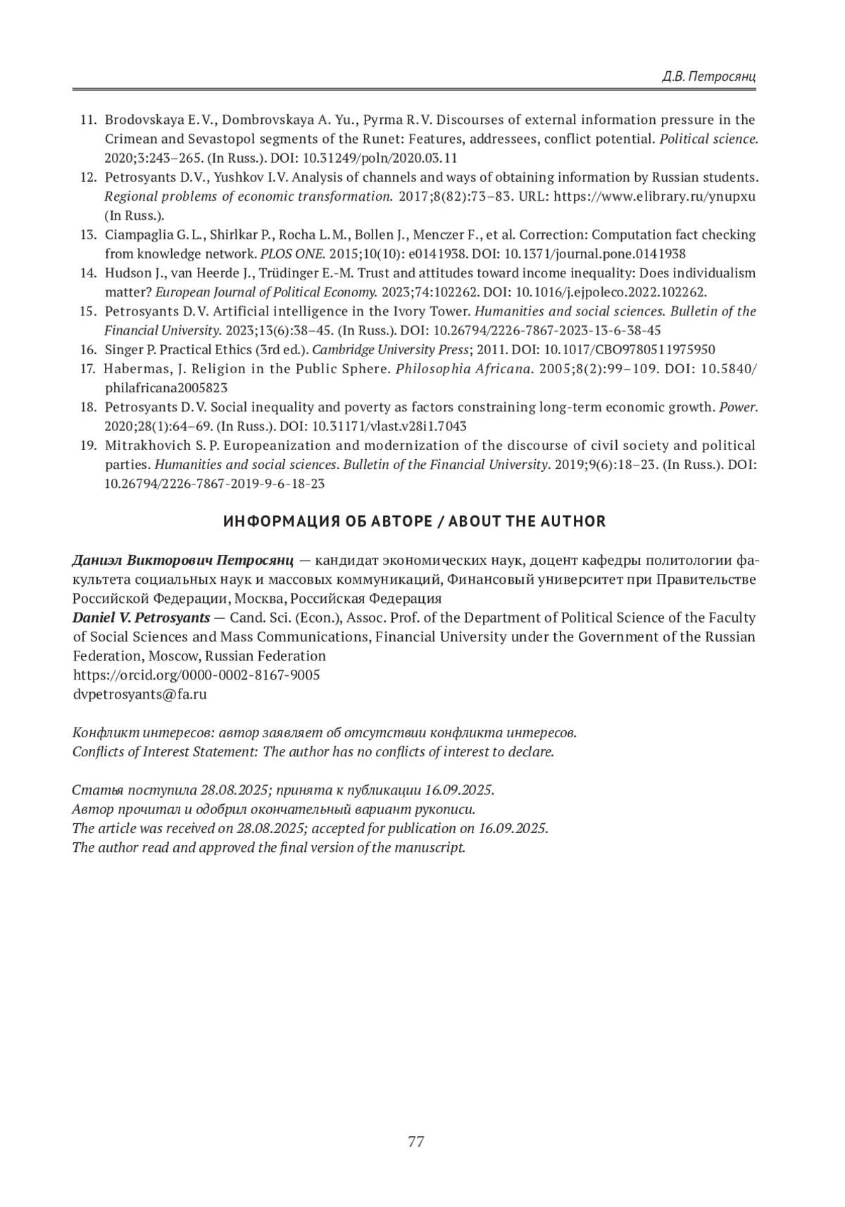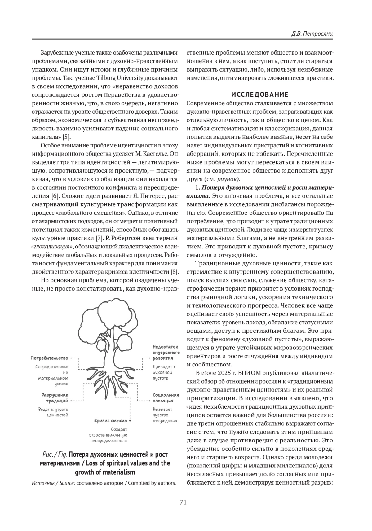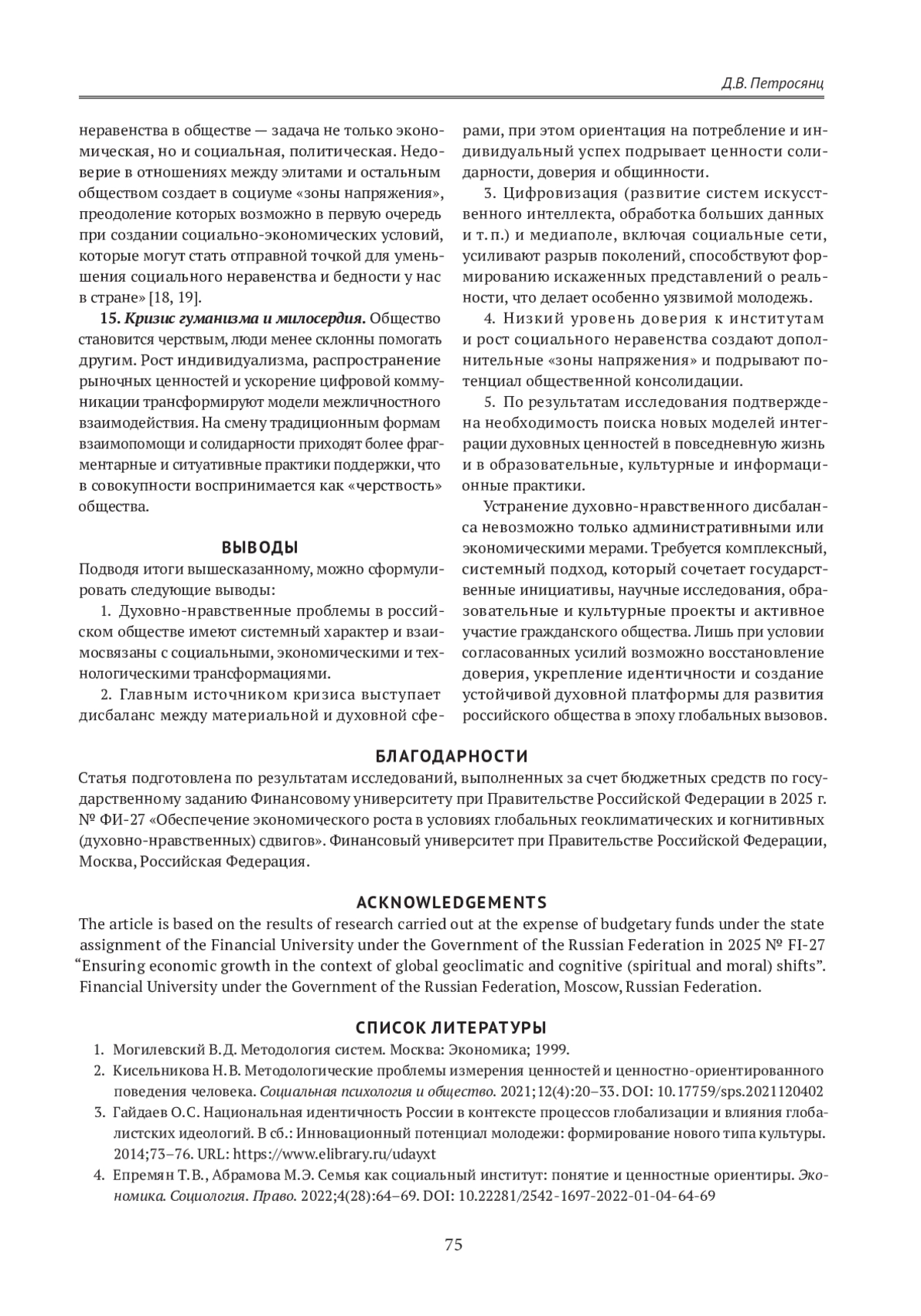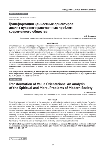 ПЕТРОСЯНЦ Д. В. ТРАНСФОРМАЦИЯ ЦЕННОСТНЫХ ОРИЕНТИРОВ: АНАЛИЗ ДУХОВНО-НРАВСТВЕННЫХ ПРОБЛЕМ СОВРЕМЕННОГО ОБЩЕСТВА // ГУМАНИТАРНЫЕ НАУКИ. ВЕСТНИК ФИНАНСОВОГО УНИВЕРСИТЕТА. 2025. ТОМ 15, № 5