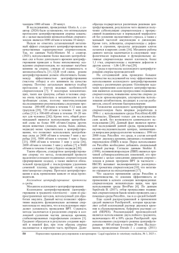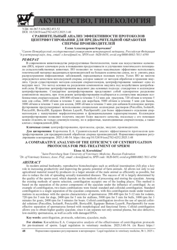 В современном животноводстве репродуктивные биотехнологии, такие как искусственное осеменение (ИО), играют ключевую роль в повышении продуктивности и улучшении генетического потенциала сельскохозяйственных животных. ИО позволяет не только максимально эффективно использовать генетический материал выдающихся производителей на большем количестве самок, но и снизить риск распространения инфекционных заболеваний, передающихся половым путем. Успех ИО во многом определяется качеством используемой спермы, которое зависит от методов обработки и хранения эякулята. Среди существующих методов селекции сперматозоидов, центрифугирование занимает одно из ведущих мест. Это метод основан на разделении компонентов эякулята под воздействием центробежной силы. В практике центрифугирования выделяют два основных подхода: стандартное и коллоидное центрифугирование. Стандартное центрифугирование представляет собой однократное разделение компонентов эякулята, при этом режим центрифугирования подбирается в соответствие видовым особенностями сперматозоидов: 200-400 об/мин в течение 5-12 мин для грызунов, 720 об/мин в течение 5 мин для собак, 2400 об/мин в течение 5 мин для жеребцов, 5000 об/мин в течение 5 мин для быков, 3000 об/мин в течение 3 мин для козлов, 2400 об/мин в течение 3 мин для кабанов Коллоидное центрифугирование предусматривает использование специальных коллоидных растворов (Percolltm, Isolate®, Porcicoll®, Bovicoll®, Equipure Bottom Layer®, PureSperm®) для более эффективного отделения сперматозоидов с наилучшими морфологическими и функциональными характеристиками. Коллоидное центрифугирование позволяет получить эякулят более высокого качества, поскольку с его помощью можно отделить не только семенную плазму, но и дефектные, малоподвижные сперматозоиды, а также клетки с поврежденной ДНК.