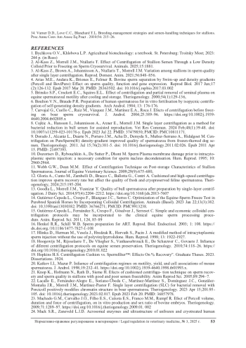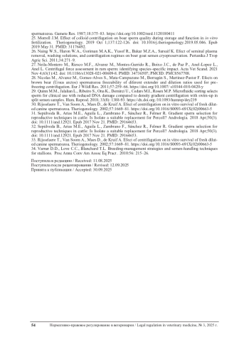 12. Gloria A., Cunto M., Zambelli D., Bracco C., Ballotta G., Contri A. Cushioned and high-speed centrifugation improve sperm recovery rate but affect the quality of fresh and cryopreserved feline spermatozoa. Theriogenology, 2024;215:195-204.