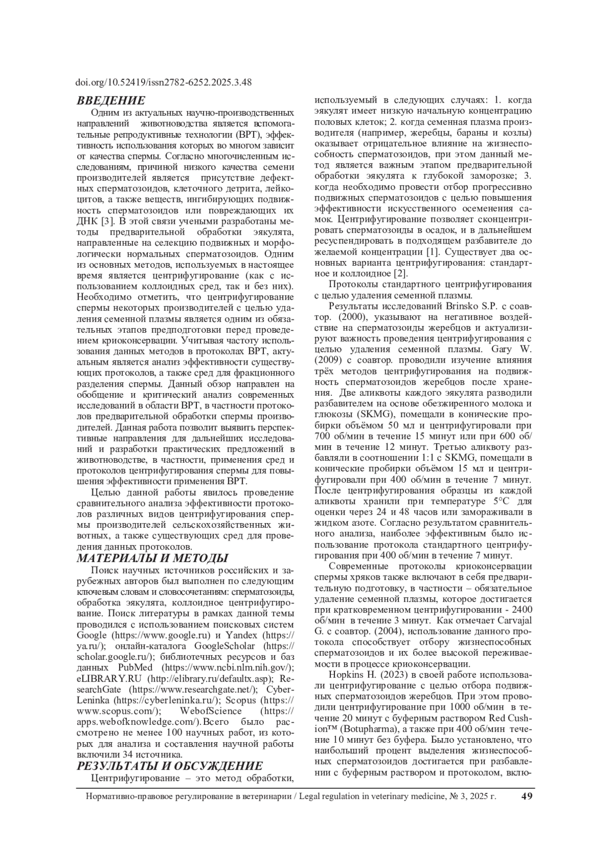 Одним из актуальных научно-производственных направлений животноводства является вспомогательные репродуктивные технологии (ВРТ), эффективность использования которых во многом зависит от качества спермы. Согласно многочисленным исследованиям, причиной низкого качества семени производителей является присутствие дефектных сперматозоидов, клеточного детрита, лейкоцитов, а также веществ, ингибирующих подвижность сперматозоидов или повреждающих их ДНК [3].