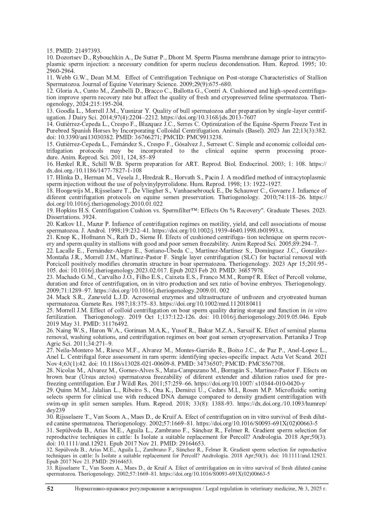 11. Webb G.W., Dean M.M. Effect of Centrifugation Technique on Post-storage Characteristics of Stallion Spermatozoa. Journal of Equine Veterinary Science. 2009;29(9):675-680.