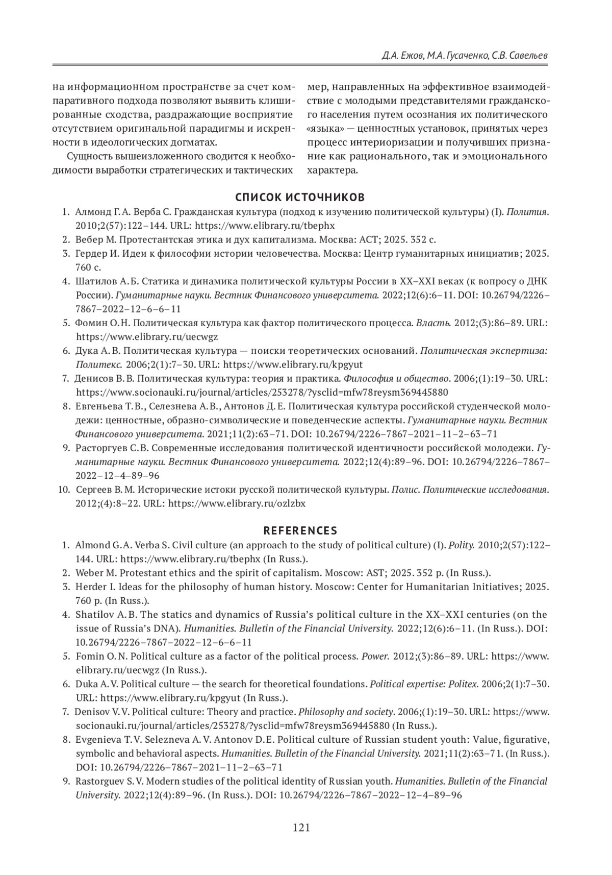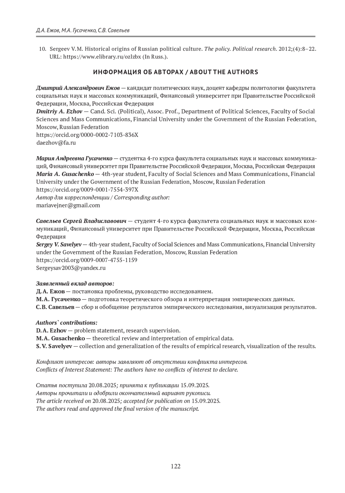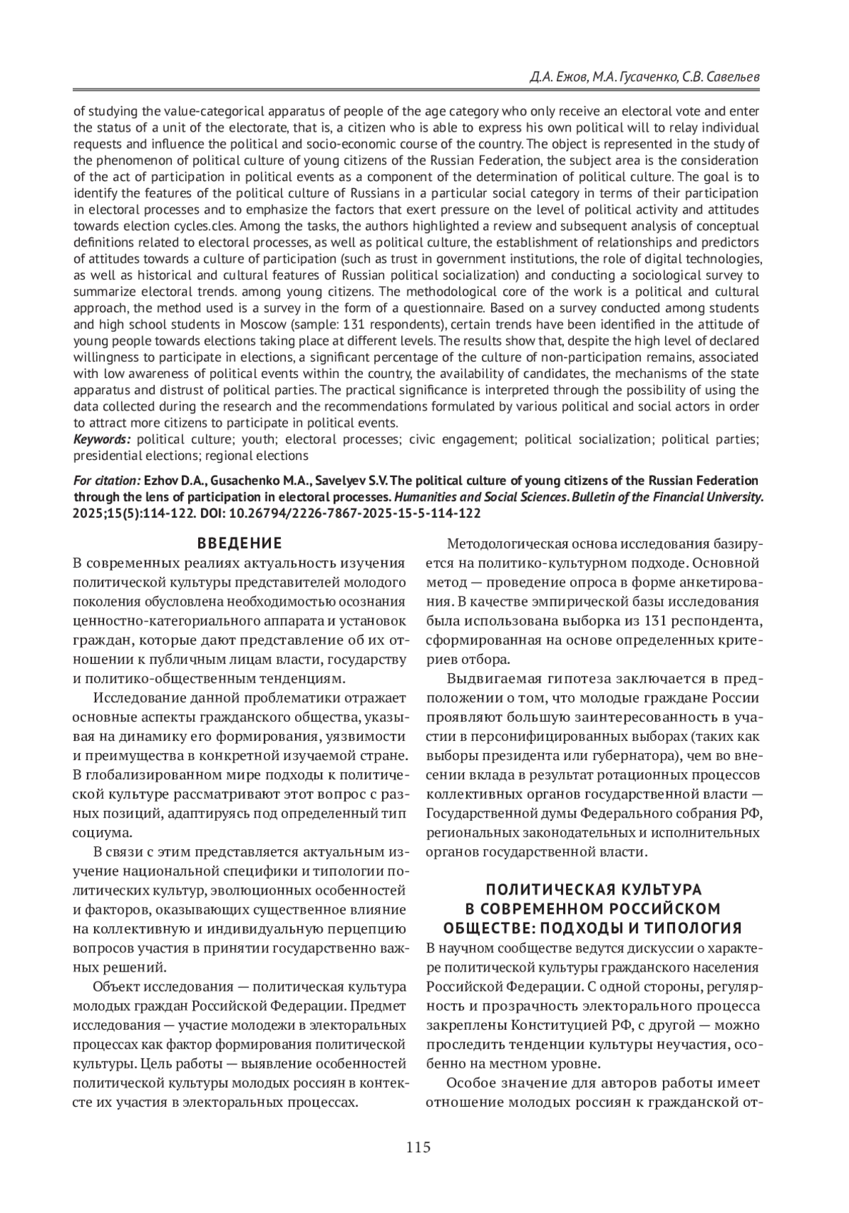ЕЖОВ Д. А., ГУСАЧЕНКО М. А. ПОЛИТИЧЕСКАЯ КУЛЬТУРА МОЛОДЫХ ГРАЖДАН РФ ЧЕРЕЗ ПРИЗМУ УЧАСТИЯ В ЭЛЕКТОРАЛЬНЫХ ПРОЦЕССАХ // ГУМАНИТАРНЫЕ НАУКИ. ВЕСТНИК ФИНАНСОВОГО УНИВЕРСИТЕТА. 2025. ТОМ 15, № 5