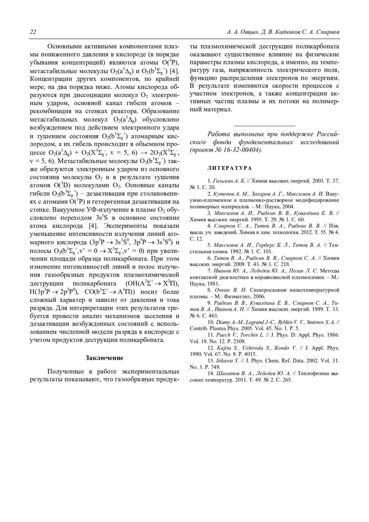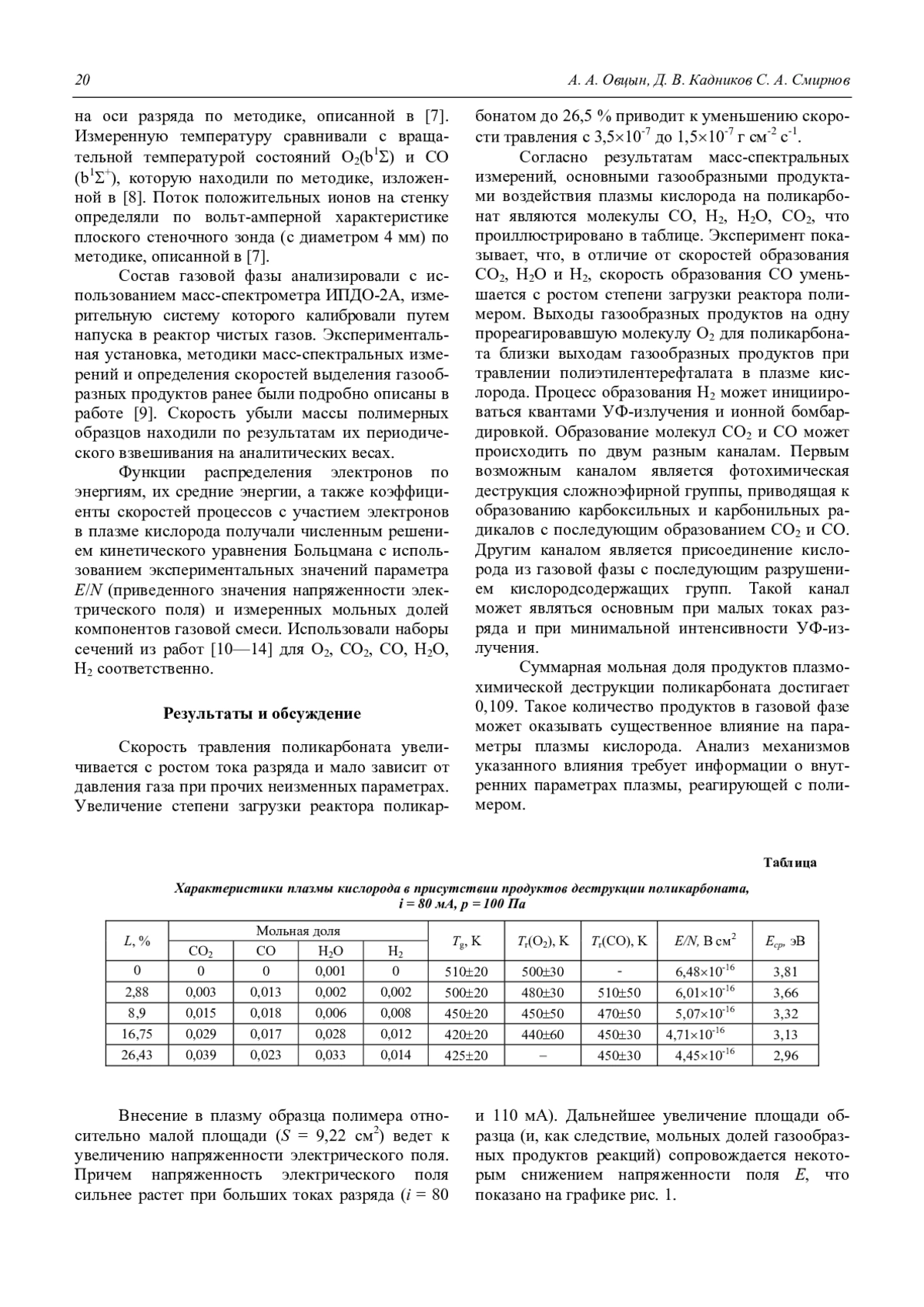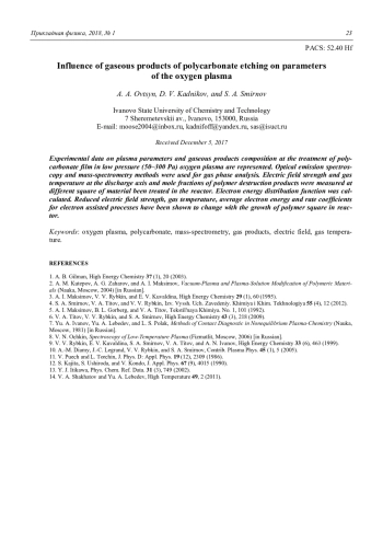 Представлены экспериментальные данные о параметрах плазмы и о составе газообразных продуктов при обработке пленки поликарбоната в плазме пониженного давления (50–300 Па) в кислороде. Анализ газовой фазы проводили методами эмиссионной спектроскопии и массспектрометрии. При различной площади обрабатываемого материала измерена напряженность электрического поля и температура газа на оси разряда, мольные доли продуктов деструкции полимера. Рассчитана функция распределения электронов по энергиям. Показано, что с увеличением площади обрабатываемого материала в реакторе изменяется приведенная напряженность электрического поля, температура газа, средняя энергия электронов и коэффициенты скоростей процессов с участием электронов.