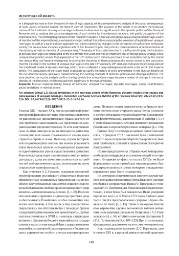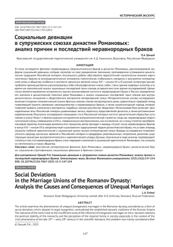 В статье исследуется феномен неравнородных (морганатических) браков в династии Романовых, рассматриваемый как форма социальной девиации, которая, несмотря на свое юридическое признание, противоречила устоявшимся династическим традициям Российской империи. Актуальность работы обусловлена недостаточной изученностью влияния морганатических браков на внутридинастические отношения, политическую стабильность монархии и восприятие императорской семьи в обществе, особенно в контексте кризисных явлений конца XIX — начала XX в. В научной литературе данная проблема преимущественно рассматривалась либо в биографическом ключе, либо с точки зрения правовых аспектов, в то время как комплексный анализ социальных последствий таких союзов оставался вне поля зрения исследователей. Целью статьи является выявление исторических причин возникновения института неравнородного брака в России, определение его значения в династической политике дома Романовых и анализ социальных последствий таких союзов для внутридинастических отношений и общественного восприятия императорской семьи. Методологическая основа исследования включает историко-генеалогический анализ брачных союзов членов императорского дома, сравнительно-правовой метод, позволяющий оценить эволюцию законодательства о неравнородных браках, а также социокультурный подход, который позволяет выявить изменения в восприятии подобных союзов российским обществом. Источниковая база включает законодательные акты Российской империи, дневниковые записи, переписку представителей династии, а также воспоминания современников. Результаты исследования показывают, что в Российской империи институт династического брака был установлен в эпоху Петра I и являлся важным инструментом внешнеполитической стратегии, тогда как неравнородные (морганатические) союзы, появившиеся в XIX в., первоначально воспринимались как исключение, но к концу столетия приобрели массовый характер. Анализируя динамику этих процессов, автор приходит к выводу, что рост числа неравнородных браков в конце XIX— начале XX в. свидетельствует о разложении традиционной модели династического брака, что, в свою очередь, отразило глубокий идеологический и социальный кризис внутри императорской семьи. Выводы исследования позволяют уточнить природу кризисных явлений в Российской империи в преддверии революционных потрясений, дополняя существующие концепции внутриполитического и идеологического упадка. Данные, полученные в ходе анализа, подтверждают гипотезу о том, что неравнородные браки стали маркером изменений в социальной идентичности Романовых, что снижало их легитимность в глазах общества.