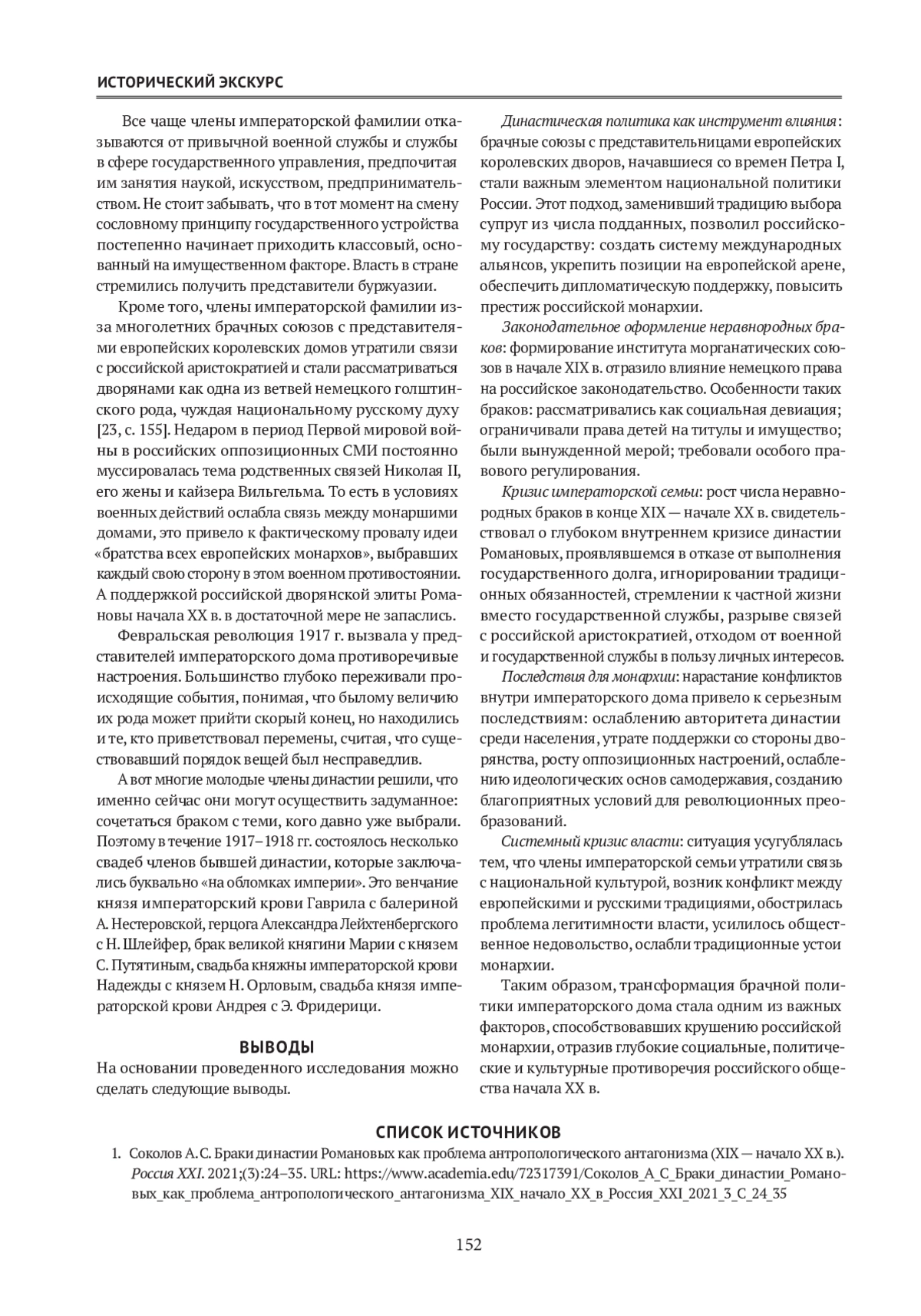 1. СоколовА.С.Браки династии Романовых как проблема антропологического антагонизма (XIX - начало XX в.). Россия XXI. 2021;(3):24-35. URL: https://www.academia.edu/72317391/Соколов_А_С_Браки_династии_Романовых_как_проблема_антропологического_антагонизма_XIX_начало_XX_в_Россия_XXI_2021_3_С_24_35