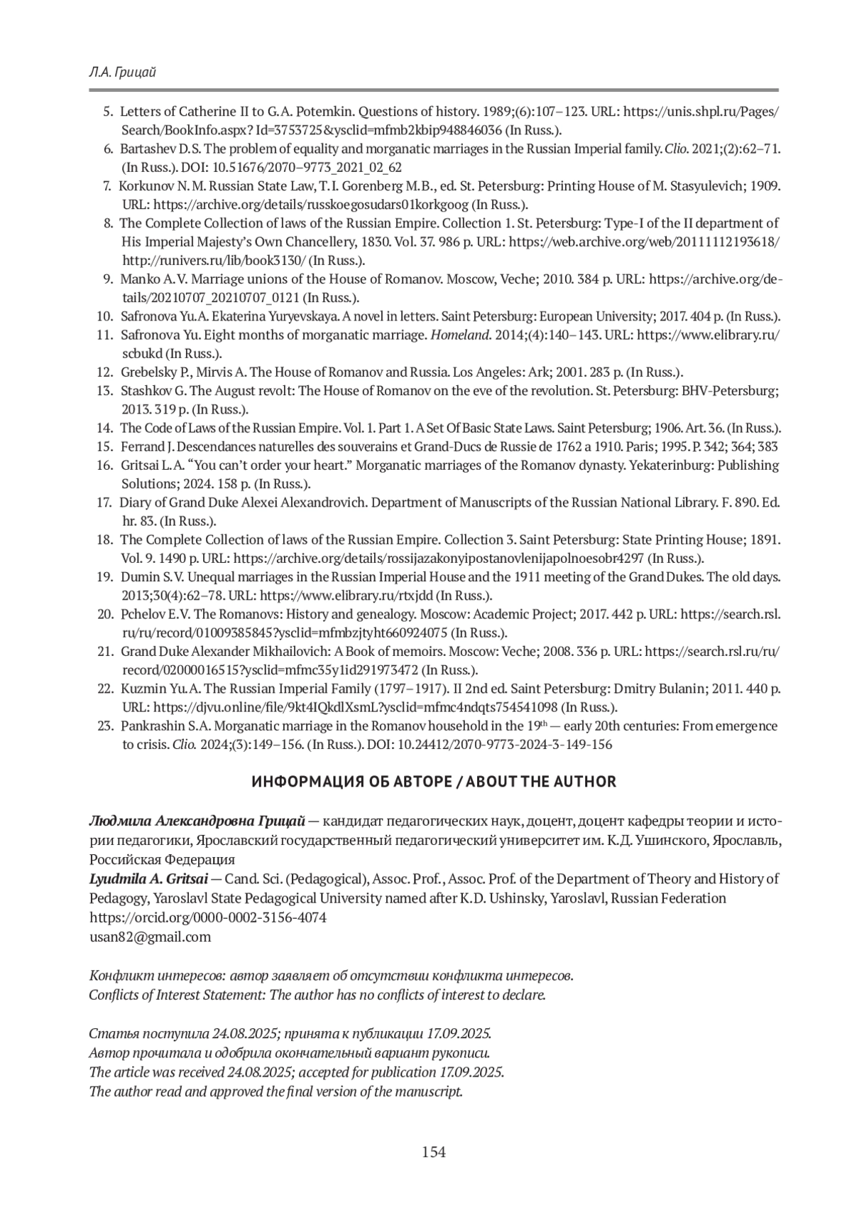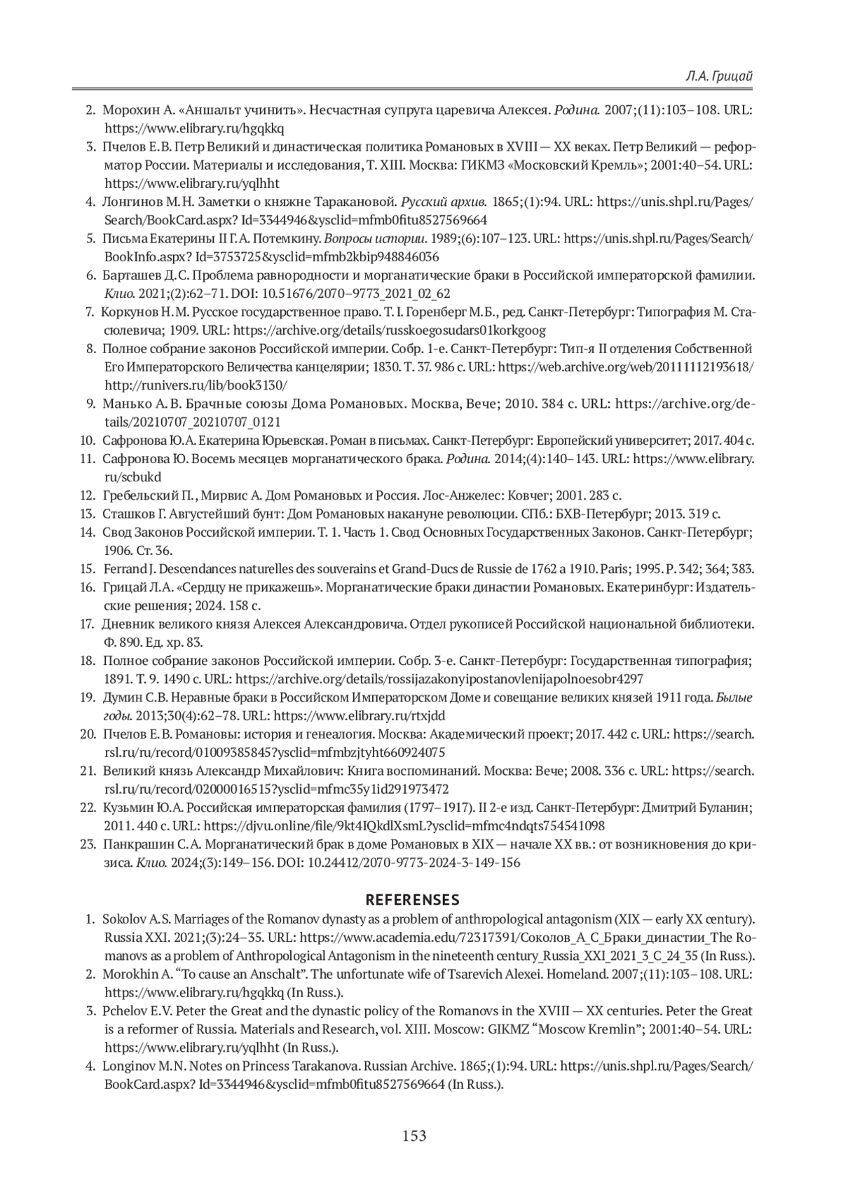 16. Грицай Л.А. «Сердцу не прикажешь». Морганатические браки династии Романовых. Екатеринбург: Издательские решения; 2024. 158 с.