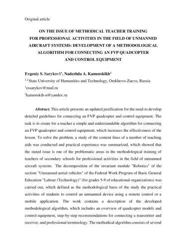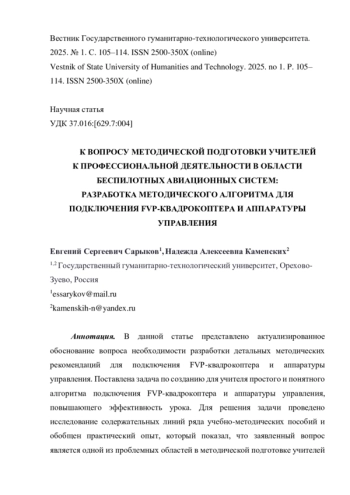 Статья: К ВОПРОСУ МЕТОДИЧЕСКОЙ ПОДГОТОВКИ УЧИТЕЛЕЙ К ПРОФЕССИОНАЛЬНОЙ ДЕЯТЕЛЬНОСТИ В ОБЛАСТИ БЕСПИЛОТНЫХ АВИАЦИОННЫХ СИСТЕМ: РАЗРАБОТКА МЕТОДИЧЕСКОГО АЛГОРИТМА ДЛЯ ПОДКЛЮЧЕНИЯ FVP-КВАДРОКОПТЕРА И АППАРАТУРЫ УПРАВЛЕНИЯ (2025)