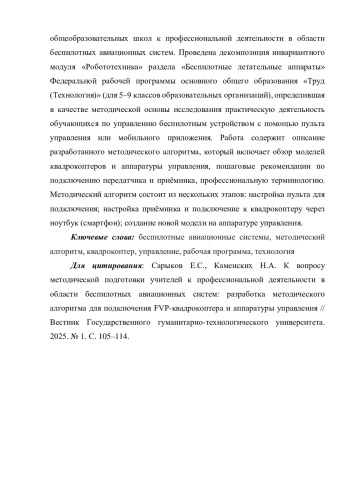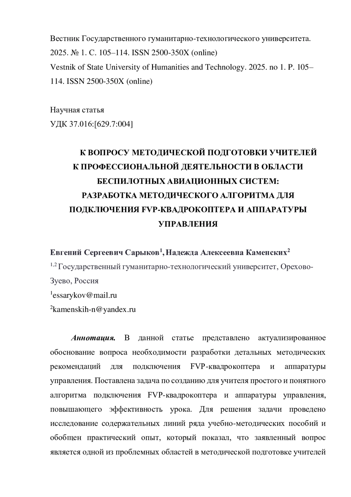 САРЫКОВ Е. С., КАМЕНСКИХ Н. А. К ВОПРОСУ МЕТОДИЧЕСКОЙ ПОДГОТОВКИ УЧИТЕЛЕЙ К ПРОФЕССИОНАЛЬНОЙ ДЕЯТЕЛЬНОСТИ В ОБЛАСТИ БЕСПИЛОТНЫХ АВИАЦИОННЫХ СИСТЕМ: РАЗРАБОТКА МЕТОДИЧЕСКОГО АЛГОРИТМА ДЛЯ ПОДКЛЮЧЕНИЯ FVP-КВАДРОКОПТЕРА И АППАРАТУРЫ УПРАВЛЕНИЯ // ВЕСТНИК ГОСУДАРСТВЕННОГО ГУМАНИТАРНО-ТЕХНОЛОГИЧЕСКОГО УНИВЕРСИТЕТА. 2025. № 1