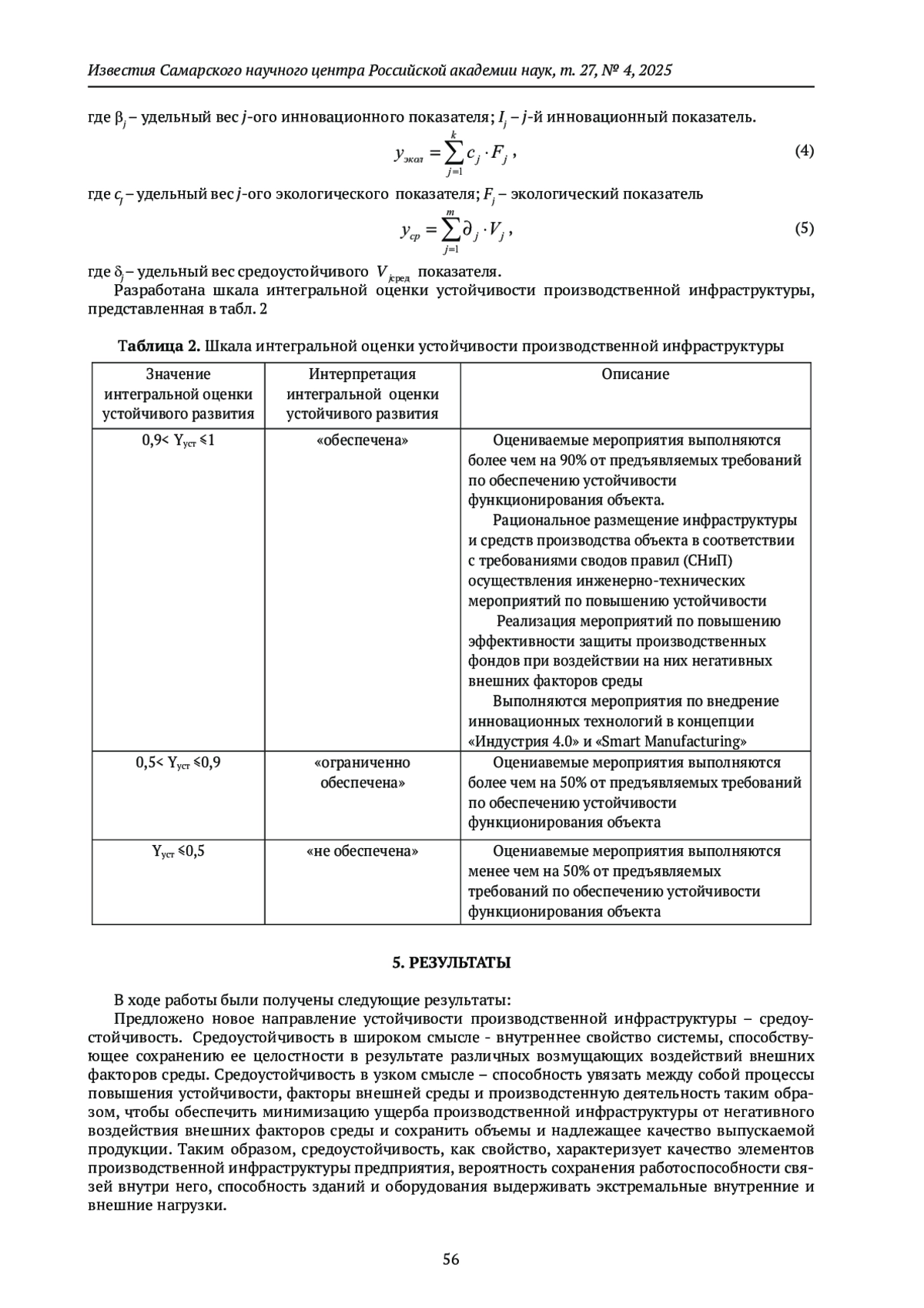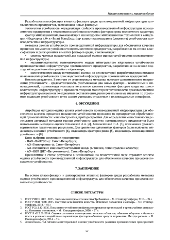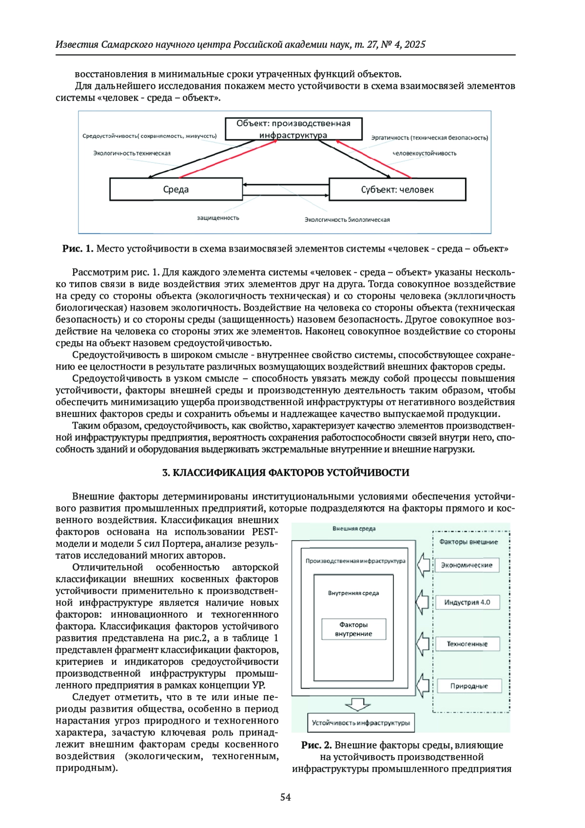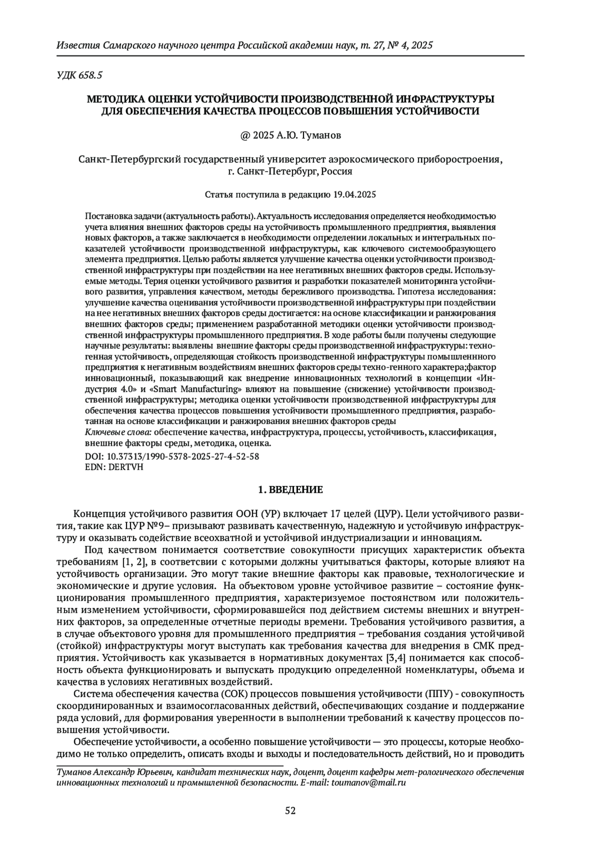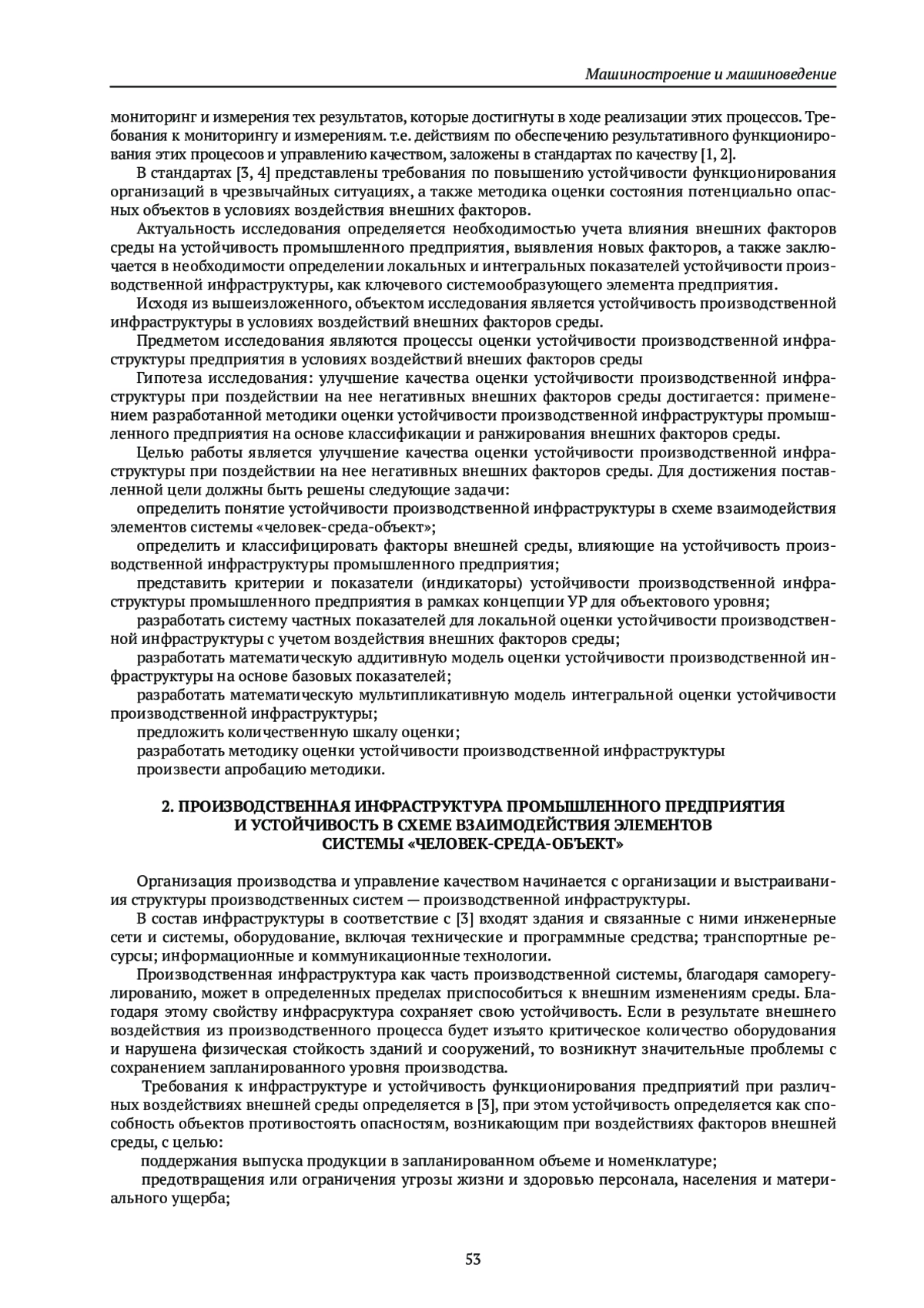 Постановка задачи (актуальность работы). Актуальность исследования определяется необходимостью учета влияния внешних факторов среды на устойчивость промышленного предприятия, выявления новых факторов, а также заключается в необходимости определении локальных и интегральных показателей устойчивости производственной инфраструктуры, как ключевого системообразующего элемента предприятия. Целью работы является улучшение качества оценки устойчивости производственной инфраструктуры при поздействии на нее негативных внешних факторов среды. Используемые методы. Терия оценки устойчивого развития и разработки показателей мониторинга устойчивого развития, управления качеством, методы бережливого производства. Гипотеза исследования: улучшение качества оценивания устойчивости производственной инфраструктуры при поздействии на нее негативных внешних факторов среды достигается: на основе классификации и ранжирования внешних факторов среды; применением разработанной методики оценки устойчивости производственной инфраструктуры промышленного предприятия. В ходе работы были получены следующие научные результаты: выявлены внешние факторы среды производственной инфраструктуры: техногенная устойчивость, определяющая стойкость производственной инфраструктуры помышленнного предприятия к негативным воздействиям внешних факторов среды техно-генного характера; фактор инновационный, показывающий как внедрение инновационных технологий в концепции «Индустрия 4.0» и «Smart Manufacturing» влияют на повышение (снижение) устойчивости производственной инфраструктуры; методика оценки устойчивости производственной инфраструктуры для обеспечения качества процессов повышения устойчивости промышленного предприятия, разработанная на основе классификации и ранжирования внешних факторов среды