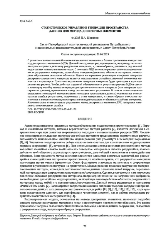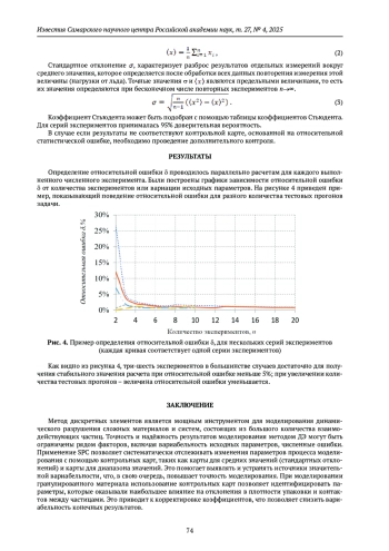 С развитием вычислительной техники и численных методов все больше применение находит метод дискретных элементов (МДЭ). Данный метод имеет ряд преимуществ, например, он позволяет рассматривать динамику разрушения материала, и, таким образом, учитывать ряд явлений недоступных континуальным методам. С помощью МДЭ возможно рассмотрение последовательности разрушения материала, дальнейшее поведение/движение обломков материала, мониторинг образования скопления обломков. Одним из вариантов реализации алгоритма генерации дискретно-элементного материала является использование случайных значений положения элементов и их размеров. При этом каждая новая генерация материала будет приводить к вариации результата расчета. Чтобы добиться заданной обеспеченности результата расчета МДЭ и свести к минимуму ошибку метода генерации дискретно-элементного материала (или генерация пространства данных), применяется метод статистического управления. В рамках статистического управления генерацией материала (или генерации пространства данных) оценивалась относительная ошибка результатов, полученных с этим материалом, и таким образом вносились изменения в алгоритм генерации материала или подтверждалась стабильность работы алгоритма.