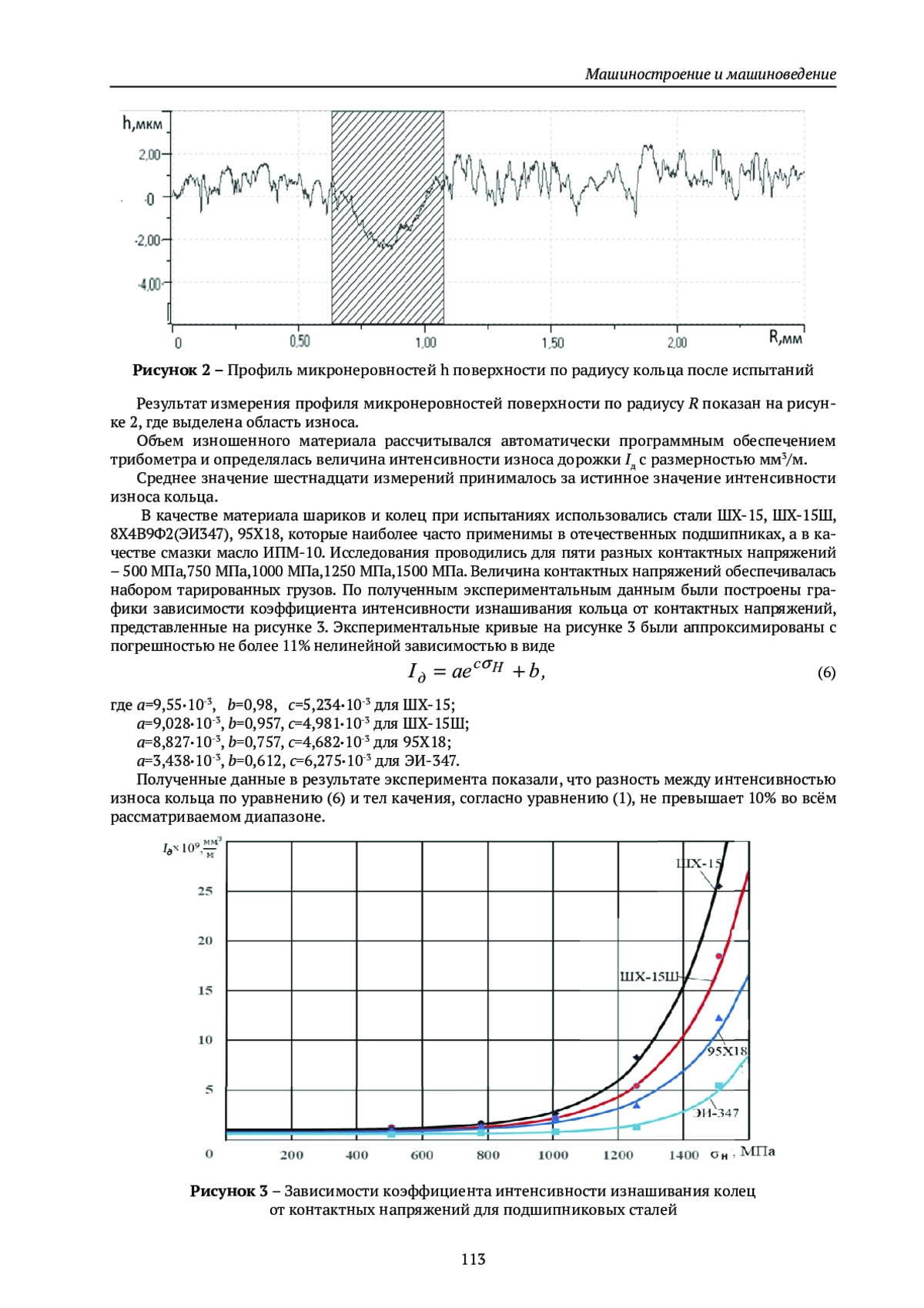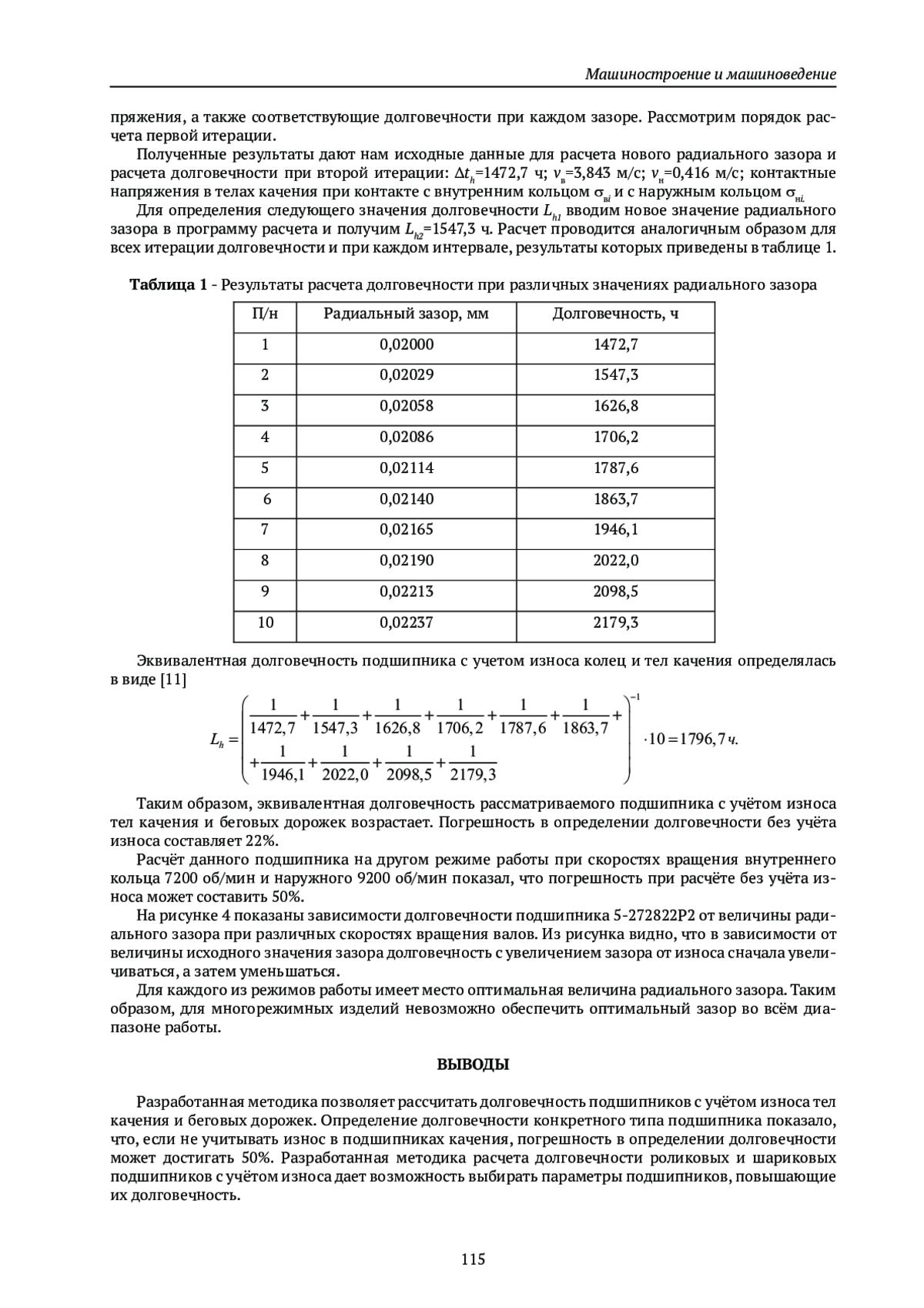 На основании экспериментальных данных получены зависимости интенсивности износа беговых дорожек от величины контактных напряжений. Эксперименты проводились на трибометре при пяти разных контактных напряжениях и по полученным экспериментальным данным были построены графики зависимости коэффициента интенсивности изнашивания беговой дорожки колец от контактных напряжений. Автором была разработана программа для расчета долговечности подшипника с учетом проскальзывания тел качения при определенном дискретном значении радиального зазора. Разработана методика определения долговечности подшипников качения с учётом износа. Приводятся результаты расчёта долговечности подшипника с учётом износа тел качения и беговых дорожек. Показано, что износ тел качения и дорожек качения приводит к увеличению радиального зазора. Выявлено, что долговечность подшипников качения существенно зависит от их износа. Показано, что погрешность в определении долговечности без учёта износа в зависимости от условия работы подшипника может достигать 50%. Разработанная методика расчета долговечности роликовых и шариковых подшипников с учётом износа дает возможность выбирать параметры подшипников, повышающие их долговечность.