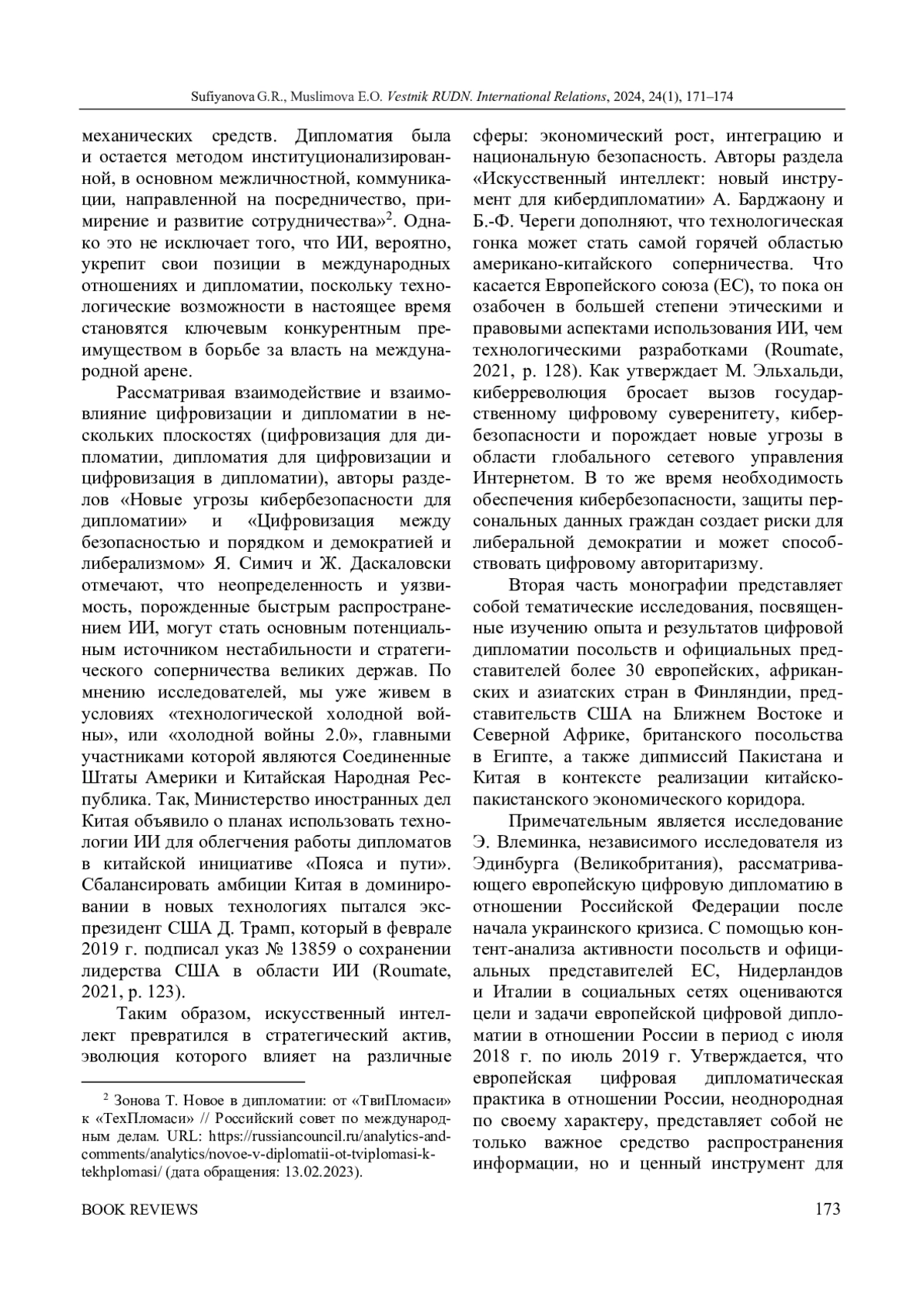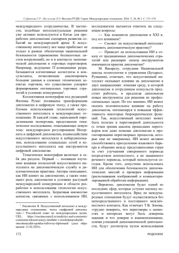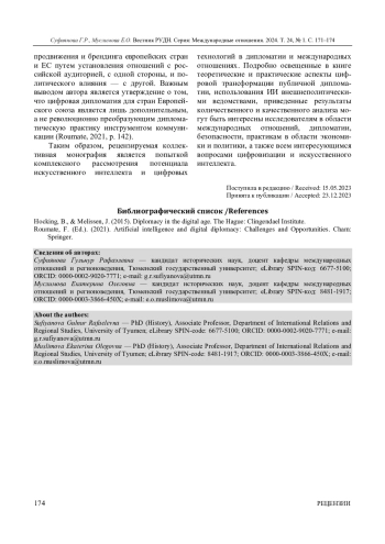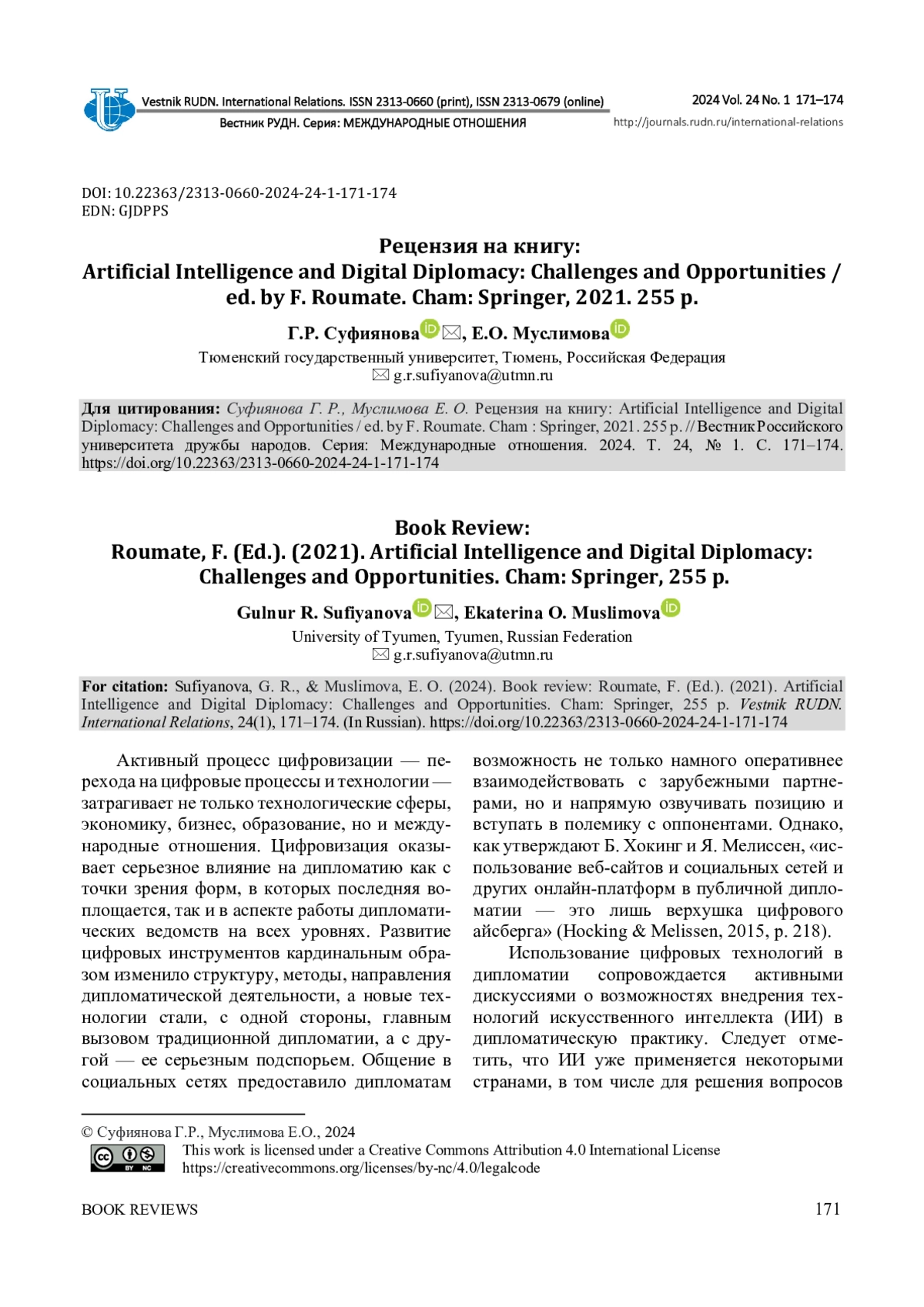 СУФИЯНОВА Г. Р., МУСЛИМОВА Е. О. РЕЦЕНЗИЯ НА КНИГУ: ARTIFICIAL INTELLIGENCE AND DIGITAL DIPLOMACY: CHALLENGES AND OPPORTUNITIES / ED. BY F. ROUMATE. CHAM: SPRINGER, 2021. 255 P. // ВЕСТНИК РОССИЙСКОГО УНИВЕРСИТЕТА ДРУЖБЫ НАРОДОВ. СЕРИЯ: МЕЖДУНАРОДНЫЕ ОТНОШЕНИЯ. 2024. ТОМ 24 № 1