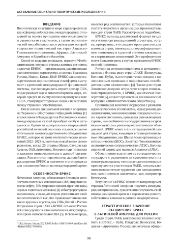 В статье анализируется геополитическая ситуация в Латинской Америке и Карибском бассейне (далее — ЛАКБ). Рассматриваются перспективы расширения межгосударственного объединения БРИКС в регионе и преимущества этой организации для страны ЛАКБ. На основе выдвинутых авторами критериев проводится анализ возможных сценариев расширения БРИКС в контексте стратегических интересов РФ на международной арене, определяются направления для наиболее благоприятного сотрудничества и обеспечения интересов России в условиях напряженной политической обстановки и развернутой коллективным Западом гибридной войны против нашей страны. Значение БРИКС повышается в условиях изменения баланса сил в ООН, группах G20 и G7 после начала специальной военной операции РФ. Теоретико-методологической основой работы выступает неореализм, в рамках которого рассматривается и глобальная ситуация в сфере международных отношений, и возможности России для продвижения своих интересов во взаимодействии с различными акторами. Основные используемые методы: ситуационный анализ и анализ документов. Цель статьи заключается в определении стратегических преимуществ для реализации внешнеполитических интересов России в связи с потенциальным расширением БРИКС в Латинской Америке.