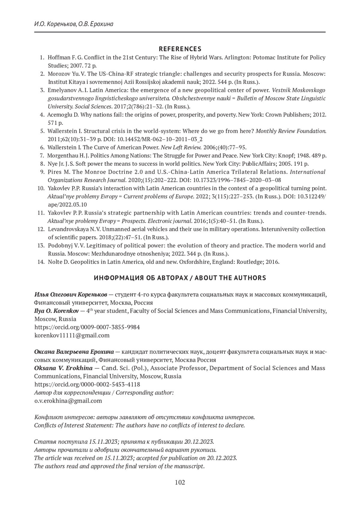 10. Яковлев П. П. Взаимодействие России с латиноамериканскими странами в условиях геополитического перелома. Актуальные проблемы Европы. 2022;3(115):227-253. https://doi.org/10.312249/ape/2022.03.10