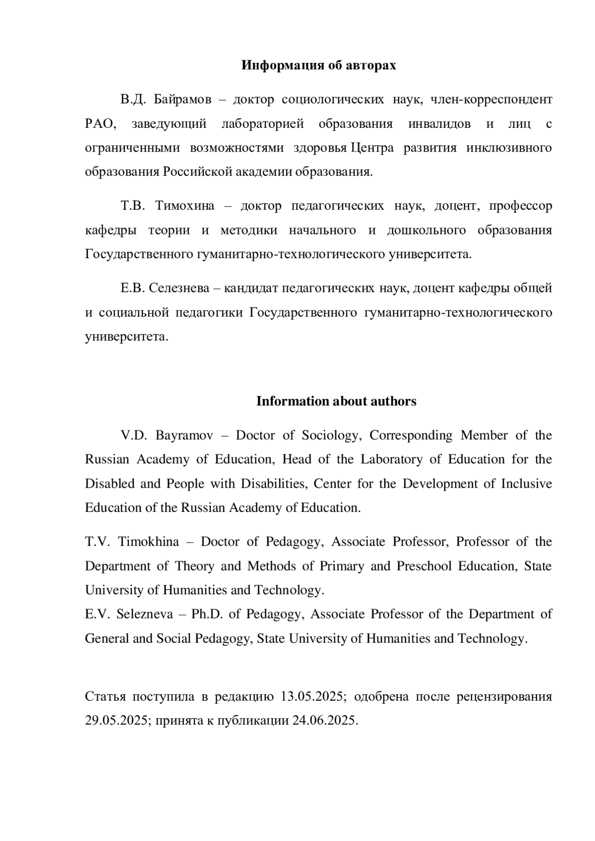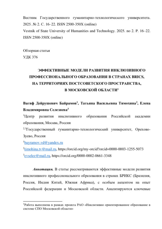 БАЙРАМОВ В. Д., ТИМОХИНА Т. В., СЕЛЕЗНЕВА Е. В. ЭФФЕКТИВНЫЕ МОДЕЛИ РАЗВИТИЯ ИНКЛЮЗИВНОГО ПРОФЕССИОНАЛЬНОГО ОБРАЗОВАНИЯ В СТРАНАХ BRICS, НА ТЕРРИТОРИЯХ ПОСТСОВЕТСКОГО ПРОСТРАНСТВА, В МОСКОВСКОЙ ОБЛАСТИ // ВЕСТНИК ГОСУДАРСТВЕННОГО ГУМАНИТАРНО-ТЕХНОЛОГИЧЕСКОГО УНИВЕРСИТЕТА. 2025. № 2