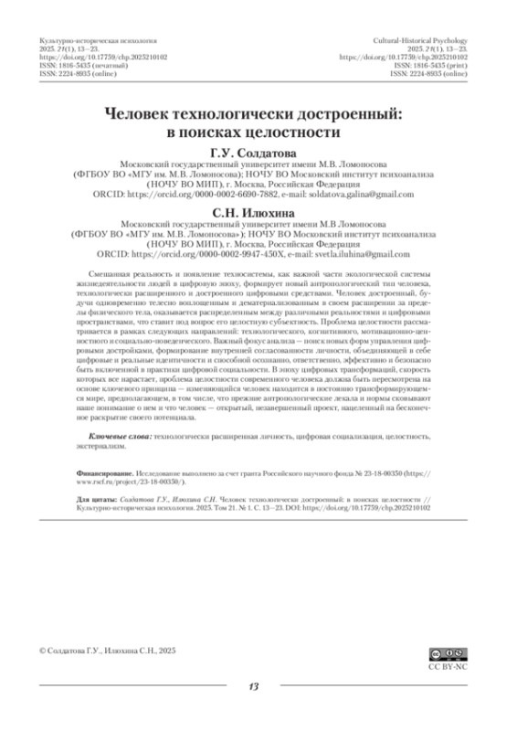 Смешанная реальность и появление техносистемы, как важной части экологической системы жизнедеятельности людей в цифровую эпоху, формирует новый антропологический тип человека, технологически расширенного и достроенного цифровыми средствами. Человек достроенный, будучи одновременно телесно воплощенным и дематериализованным в своем расширении за пределы физического тела, оказывается распределенным между различными реальностями и цифровыми пространствами, что ставит под вопрос его целостную субъектность. Проблема целостности рассматривается в рамках следующих направлений: технологического, когнитивного, мотивационно-ценностного и социально-поведенческого. Важный фокус анализа — поиск новых форм управления цифровыми достройками, формирование внутренней согласованности личности, объединяющей в себе цифровые и реальные идентичности и способной осознанно, ответственно, эффективно и безопасно быть включенной в практики цифровой социальности. В эпоху цифровых трансформаций, скорость которых все нарастает, проблема целостности современного человека должна быть пересмотрена на основе ключевого принципа — изменяющийся человек находится в постоянно трансформирующемся мире, предполагающем, в том числе, что прежние антропологические лекала и нормы сковывают наше понимание о нем и что человек — открытый, незавершенный проект, нацеленный на бесконечное раскрытие своего потенциала.