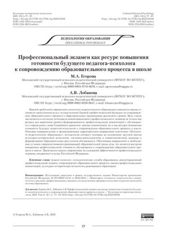 Важной проблемой современного психолого-педагогического образования становится оценка готовности выпускников вуза к осуществлению базовой профессиональной функции по сопровождению образовательного процесса в образовательных организациях различного уровня. Цель статьи заключается в изучении потенциала демонстрационного профессионального экзамена не только как ресурса для выявления уровня сформированности профессиональных компетенций у обучающихся и определения «зоны ближайшего развития» данных компетенций, но и как ресурса повышения готовности будущих педагогов-психологов к сопровождению образовательного процесса в школе. Описаны содержательные и организационные характеристики направления подготовки «Психолого-педагогическое образование», методология которого основана на положениях научной школы культурно-исторической психологии, системно-деятельностном и компетентностном подходах к формированию образовательных результатов обучающихся. Обоснованы направления и необходимые условия совершенствования развивающей образовательной среды вуза, что является ресурсом повышения профессиональной готовности обучающихся к сопровождению образовательного процесса в школе. Представлен анализ современных исследований эффективности профессионального экзамена, внедряемого в вузах Российской Федерации.