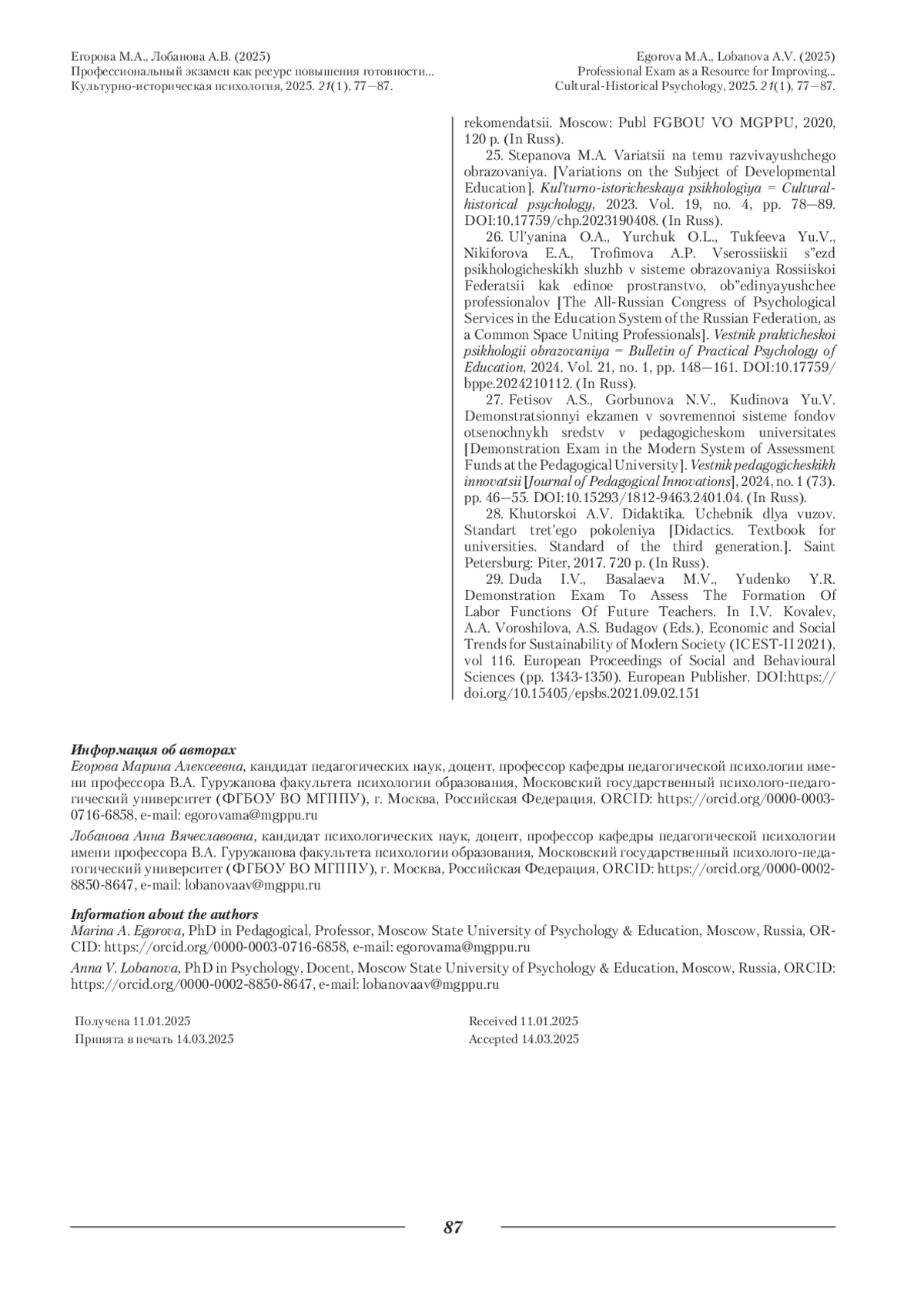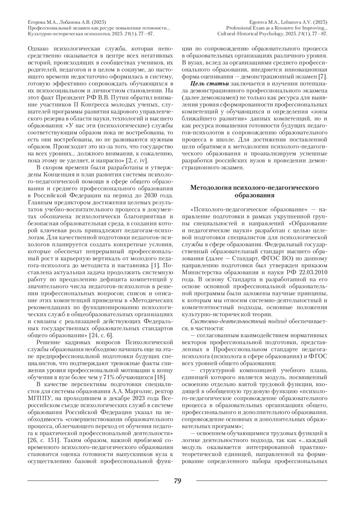 7. Егоренко Т.А., Леонова О.И., Голованова И.А. Демонстрационный экзамен как форма оценки сформированности профессиональных компетенций у будущих педагогов- психологов // Психологическая наука и образование. 2024. Том 29. № 6. С. 54-66. DOI: 10.17759/pse.2024290604
