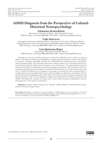 Диагноз синдрома дефицита внимания и гиперактивности (СДВГ) был предметом постоянных дискуссий, при этом многочисленные дискуссии оспаривали его обоснованность и ставили под сомнение доказательства, подтверждающие его существование. Эта статья тщательно исследует дебаты о СДВГ, используя призму культурно-исторической нейропсихологии. Эта конкретная концепция глубоко укоренена в культурно-исторической теории, разработанной такими выдающимися учеными, как Выготский, Лурия и Леонтьев. В статье кратко излагаются теоретические основы культурноисторической нейропсихологии и продолжается обсуждение вопросов развития внимания с позиций культурно-исторической теории. Критически обсуждаются симптомы СДВГ и иллюстрируются сравнительные преимущества культурно-исторической нейропсихологии. Авторы решительно выступют за смену парадигмы от традиционного диагностического подхода к подходу, основанному на культурно-исторических нейропсихологических принципах. Утверждается, что этот подход обеспечивает более персонализированную, объяснительную и целостную перспективу, которая лучше подходит для решения и понимания трудностей, связанных с СДВГ. Эта система учитывает уникальные потребности каждого ребенка, предлагая комплексный и индивидуальный подход к его конкретным обстоятельствам.