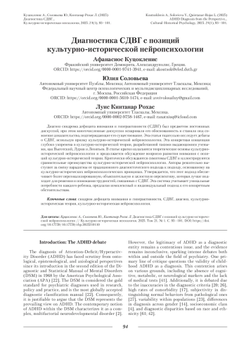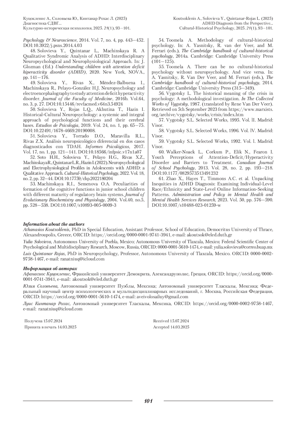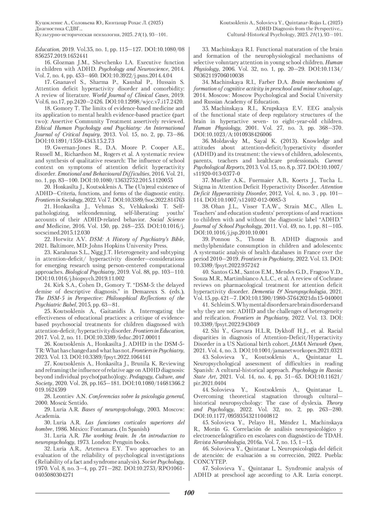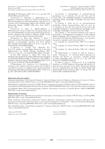 52. Сото Х.Х., Соловьева Ю., Пелайо Х.Г., Ривас Х.З., Мачинская Р., Кинтанар Л.Р., Хазин И. (2022). Нейропсихологические и электрофизиологические профили подростков с СДВГ: качественный подход. Культурно-историческая психология, 2022. Том 18, № 2, с. 32–44. DOI: 10.17759/chp.2022180204