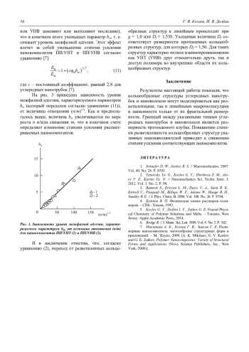 Применение современных экспериментальных методов (ультрамалоуглового рассеяния рентгеновских лучей и малоуглового рассеяния нейтронов) показало, что углеродные нанотрубки в суспензиях и полимерной матрице нанокомпозитов образуют кластеры, аналогичные макромолекулярным клубкам полимерных цепей. Эта аналогия позволяет использование хорошо разработанных и опробированных методов физической химии (в том числе и фрактальной) для описания структуры указанных кластеров, которая является определяющим фактором в формировании свойств нанокомпозитов полимер/углеродные нанотрубки. Анализ структуры этих кластеров (кольцеобразных формирований) углеродных нанотрубок в полимерной матрице нанокомпозитов полипропилен/углеродные нанотрубки (нановолокна) показал, что они могут быть аналогами макромолекулярных клубков как линейных, так и разветвленных полимерных цепей, что определяется фрактальной размерностью кластеров. Граничным условием реализации того или иного типа кластеров является достижение критерия их протекаемости или фрактальной размерности кластера, равной 1,50: если эта размерность 1,50, то кластеры являются аналогом линейных полимерных цепей, а при размерности >1,50 – разветвленных. При одинаковом содержании нанонаполнителя аналоги линейных цепей позволяют получить более высокую степень усиления (модуль упругости) нанокомпозитов, чем аналоги разветвленных. В первую очередь это обусловлено более высоким уровнем межфазной адгезии полимерная матрица – нанонаполнитель для первого типа кластеров углеродных нанотрубок (нановолокон) по сравнению со вторым. Предложены уравнения, позволяющие количественную оценку степени усиления рассматриваемых нанокомпозитов на основе только степени разветвленности кластеров и содержания нанонаполнителя, которые показали хорошее соответствие с экспериментальными данными.