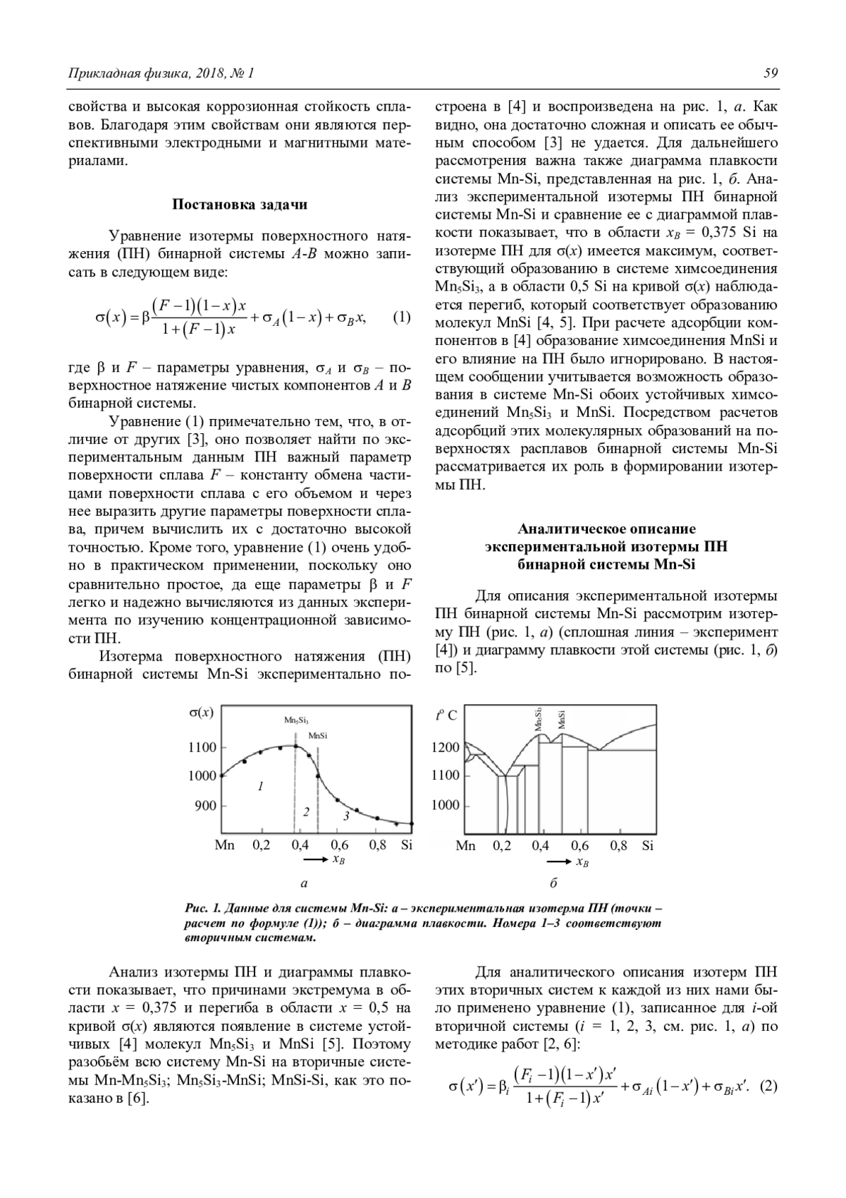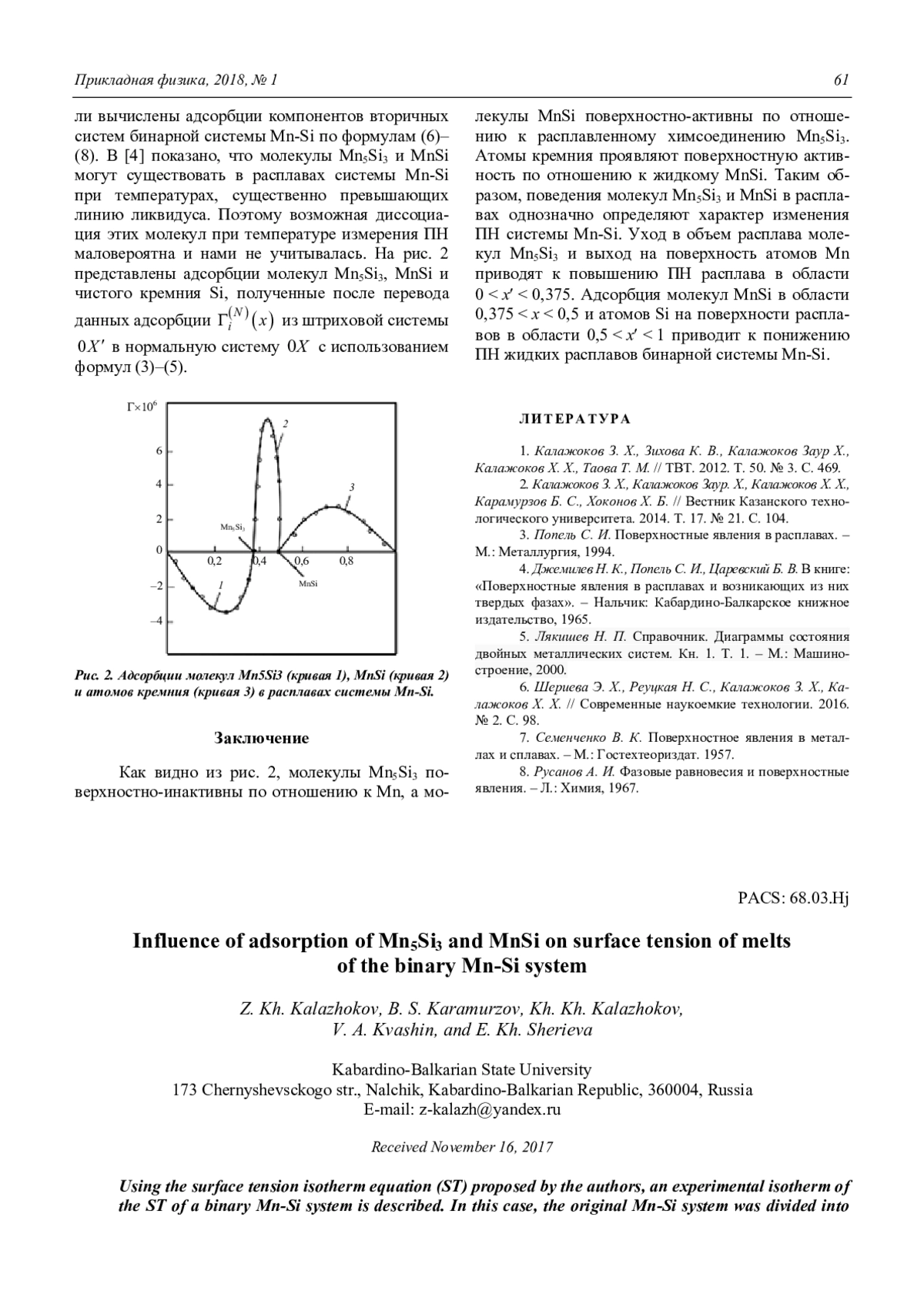 КАЛАЖОКОВ З. Х., КАРАМУРЗОВ Б. С., КАЛАЖОКОВ Х. Х., КВАШИН В. А., ШЕРИЕВА Э. Х. ВЛИЯНИЕ СОЕДИНЕНИЙ MN5SI3 И MNSI НА ПОВЕРХНОСТНОЕ НАТЯЖЕНИЕ РАСПЛАВОВ БИНАРНОЙ СИСТЕМЫ MN-SI // ПРИКЛАДНАЯ ФИЗИКА. 2018. №1