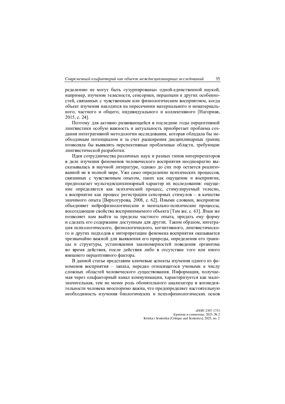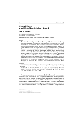 Рассматриваются ключевые подходы к изучению феномена обонятельного восприятия, зависящие от позиции интерпретатора. Несмотря на неодинаковые «точки отсчета» различных областей знаний, изучающих обонятельную перцепцию, имеется значительная доля пересечений, позволяющих объяснить сложную природу обонятельных впечатлений и особенности перцептивнокогнитивной деятельности в целом. Автором представлен аналитический обзор научных работ, посвященных изучению запаха как биологического и семиотического феномена, изложены различные филологические подходы к исследованию одоро-ольфакторного фрагмента словаря, определены перспективные проблемные области интерпретации обонятельной перцепции, требующие лингвистической разработки.