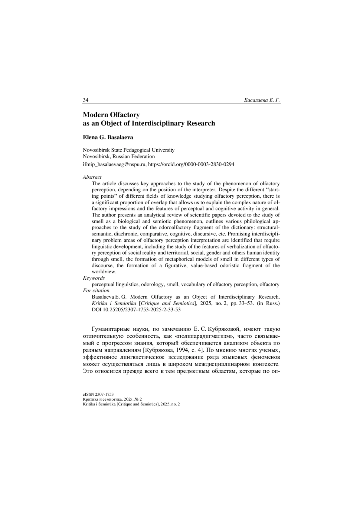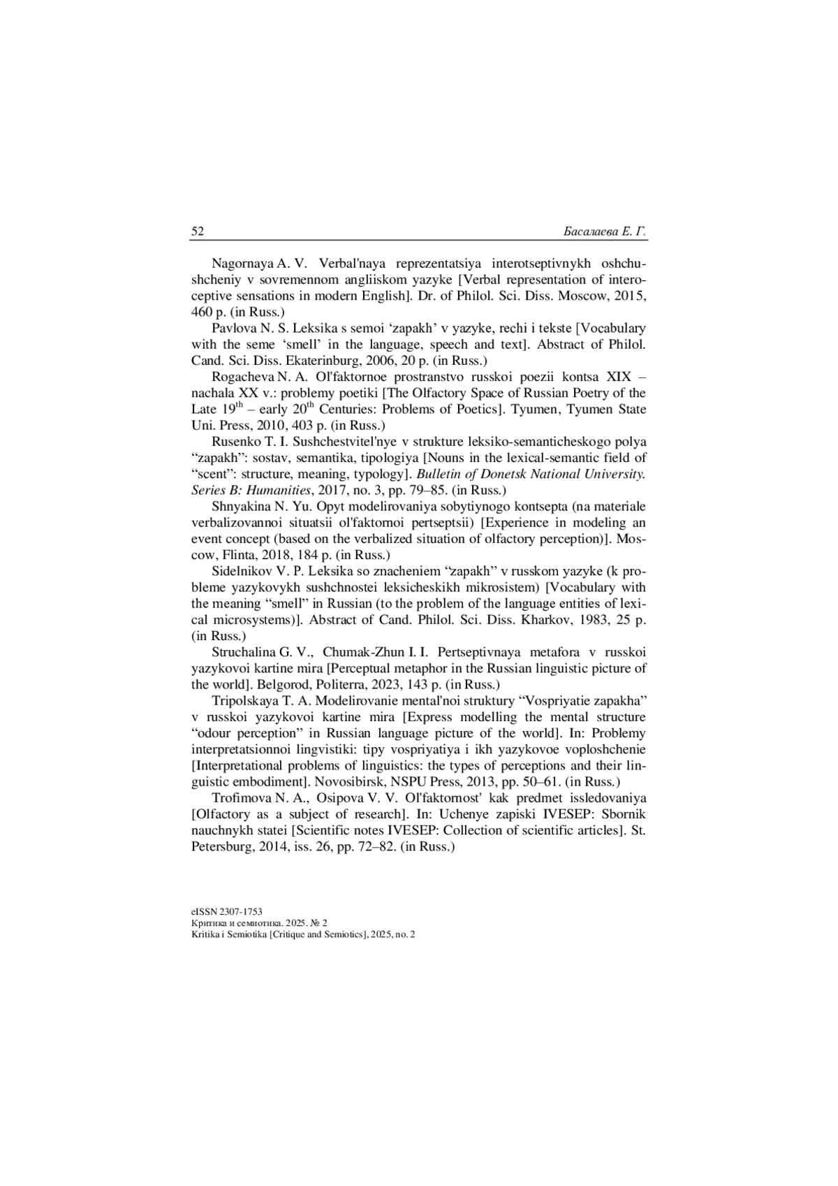 1. Басалаева Е. Г. О некоторых особенностях становления одоративной метафорической микросистемы русского языка // Сибирский филологический журнал. 2011. № 4. С. 192-199.