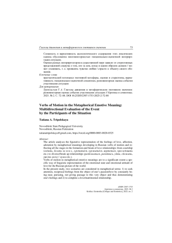 Настоящая статья продолжает исследование прагматического потенциала метафорических эмотивных значений в русском языке (в сопоставлении с английским и французским языками) [Булыгина и др., 2023]. В ней анализируется образное представление о любовных и матримониальных отношениях, вербализуемое с помощью метафорических значений, которые развиваются у русских глаголов движения: