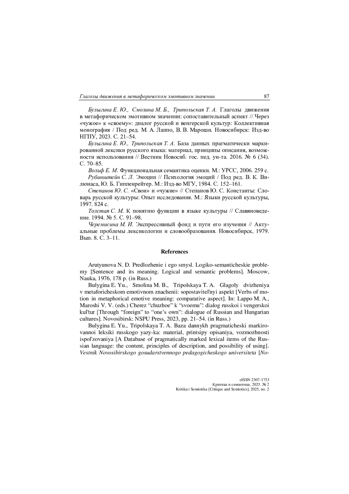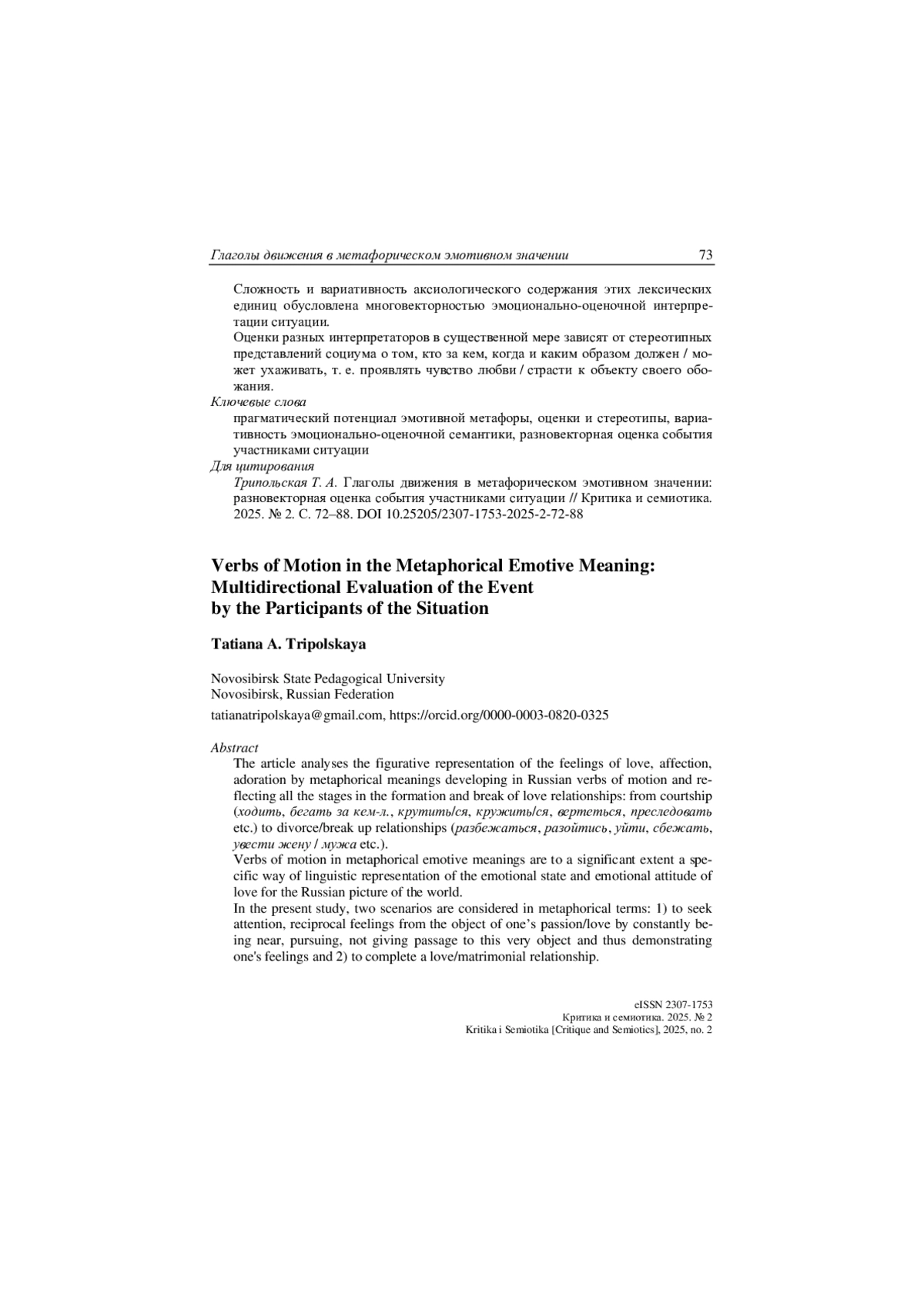- Булыгина Е. Ю., Смолина М. Б., Трипольская Т. А. Глаголы движения в метафорическом эмотивном значении: сопоставительный аспект // Через «чужое» к «своему»: диалог русской и венгерской культур: Коллективная монография / Под ред. М. А. Лаппо, В. В. Мароши. Новосибирск: Изд-во НГПУ, 2023. С. 21–54.
