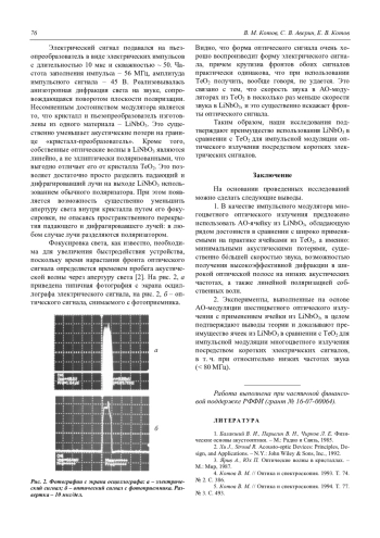 2. Эксперименты, выполненные на основе АО-модуляции шестицветного оптического излучения с применением ячейки из LiNbO3, в целом подтверждают выводы теории и доказывают преимущество ячеек из LiNbO3 в сравнении с TeO2 для импульсной модуляции многоцветного излучения посредством коротких электрических сигналов, в т. ч. при относительно низких частотах звука (< 80 МГц).