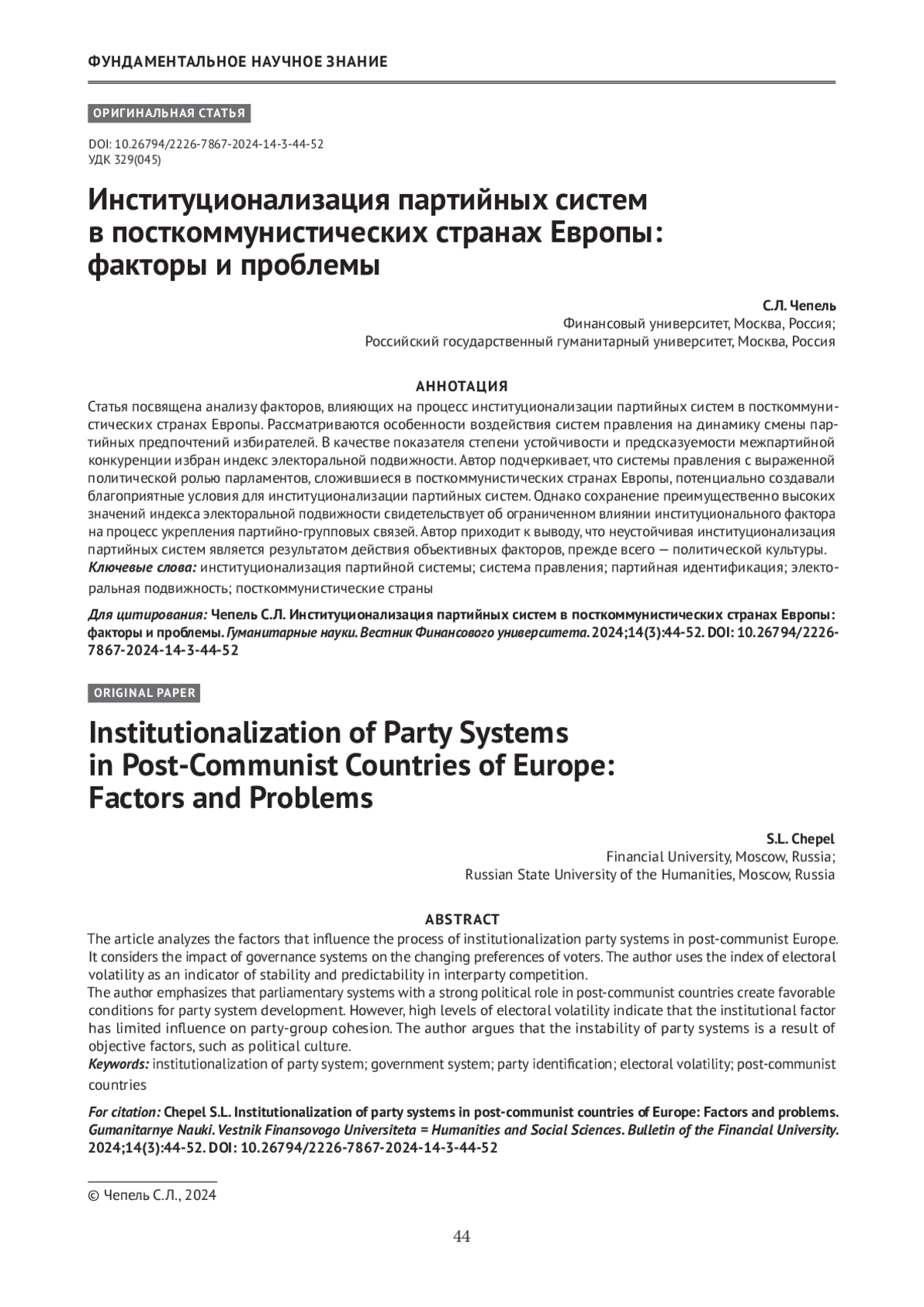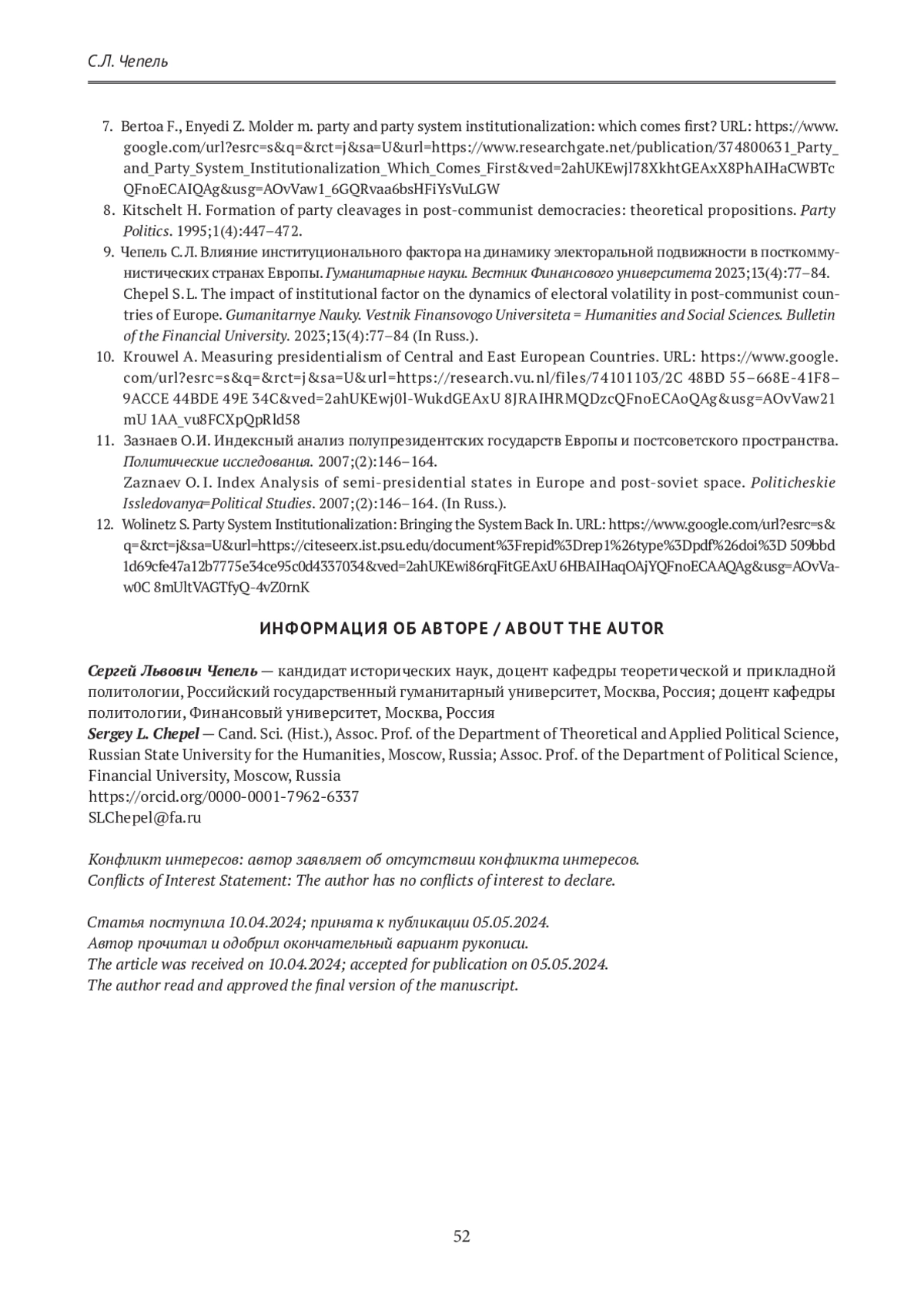 9. Чепель С. Л. Влияние институционального фактора на динамику электоральной подвижности в посткоммунистических странах Европы. Гуманитарные науки. Вестник Финансового университета 2023;13(4):77-84.