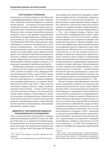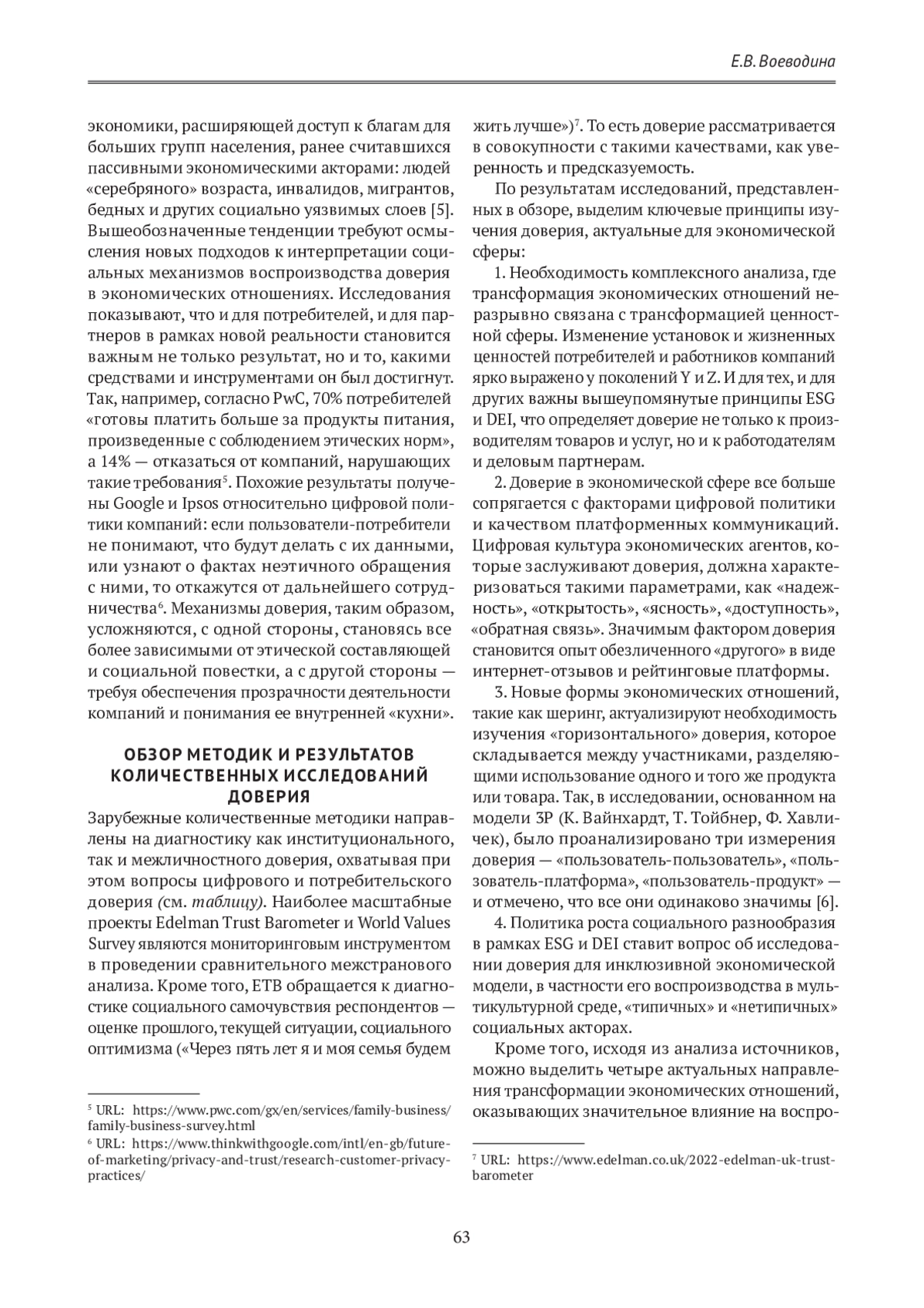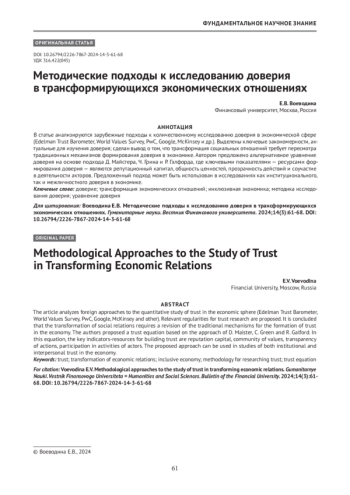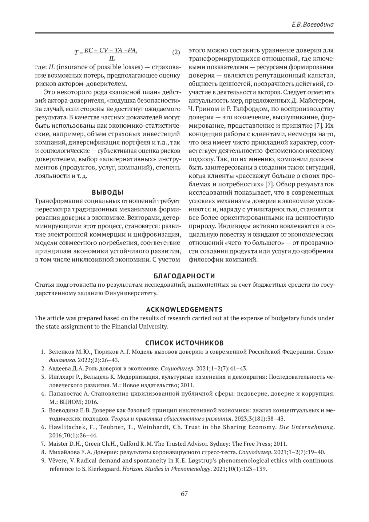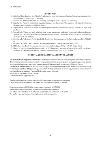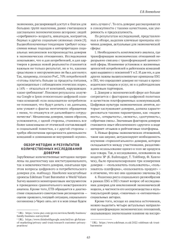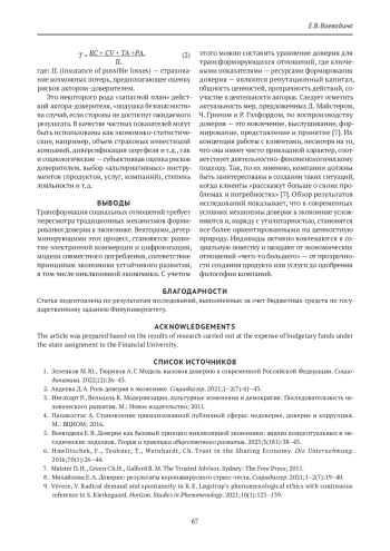 5. Воеводина Е. В. Доверие как базовый принцип инклюзивной экономики: анализ концептуальных и методических подходов. Теория и практика общественного развития. 2023;3(181):38-43.