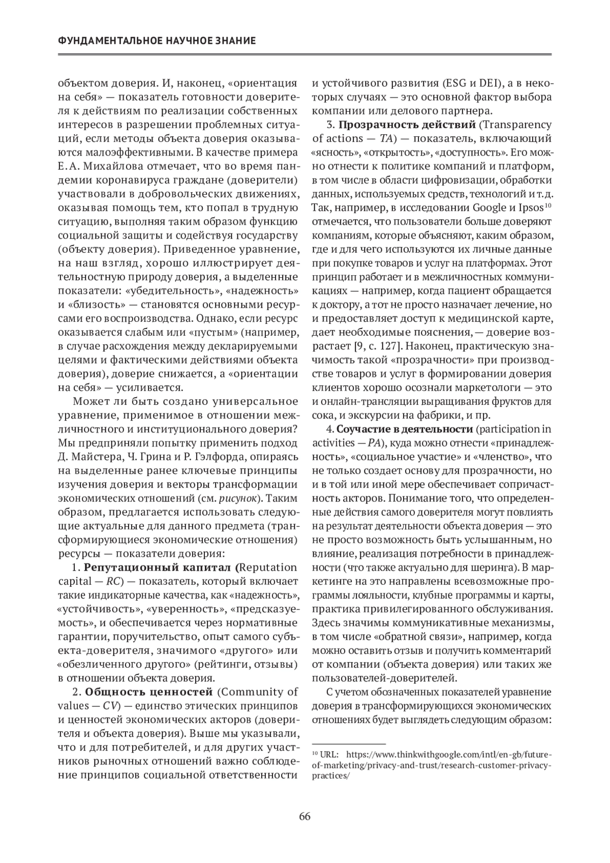 В статье анализируются зарубежные подходы к количественному исследованию доверия в экономической сфере (Edelman Trust Barometer, World Values Survey, PwC, Google, McKinsey и др.). Выделены ключевые закономерности, актуальные для изучения доверия; сделан вывод о том, что трансформация социальных отношений требует пересмотра традиционных механизмов формирования доверия в экономике. Автором предложено альтернативное уравнение доверия на основе подхода Д. Майстера, Ч. Грина и Р. Гэлфорда, где ключевыми показателями — ресурсами формирования доверия — являются репутационный капитал, общность ценностей, прозрачность действий и соучастие в деятельности акторов. Предложенный подход может быть использован в исследованиях как институционального, так и межличностного доверия в экономике.
