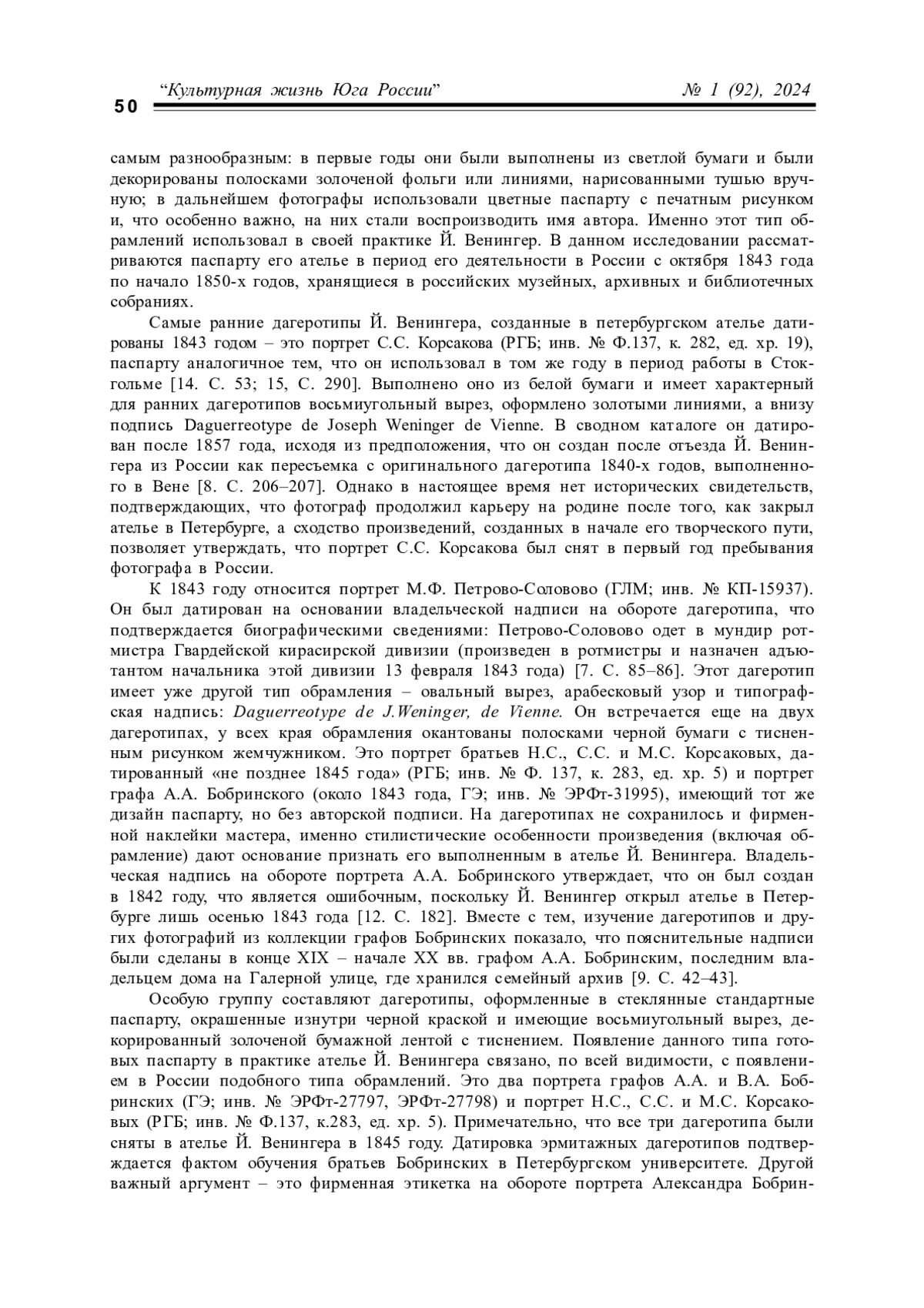 Статья посвящена проблеме атрибуции произведений ранней русской фотографии. На примере дагеротипов Й. Венингера рассматривается возможность использования обрамлений для определения авторства. Выделяются и описываются основные типы монтировок, предпринимается попытка расположить их в хронологической последовательности; попутно поднимаются актуальные атрибуционные вопросы. Акцентируется внимание на противоречиях, возникающих при изучении дагеротипов, и на проблемах, связанных с опытом реконструкции утраченных обрамлений. Отсутствие исследований, посвященных изучению дагеротипных обрамлений, делает настоящую статью чрезвычайно актуальной