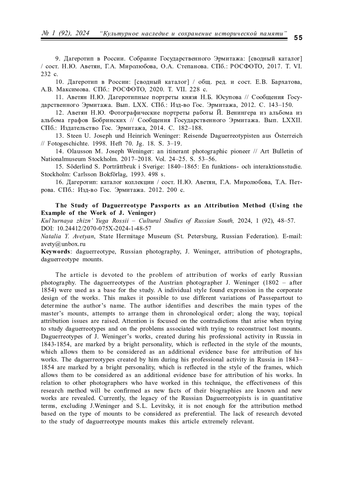 12. Аветян Н.Ю. Фотографические портреты работы Й. Венингера из альбома из альбома графов Бобринских // Сообщения Государственного Эрмитажа. Вып. LXXII. СПб.: Издательство Гос. Эрмитажа, 2014. С. 182-188.
