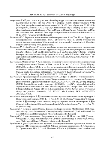 4. Болдонова И. С., Лю Сюэцин. Русские и китайские концепты в межкультурном диалоге: герменевтический подход // Вестник Бурятского государственного университета. Филология. 2024. Вып. 3. С. 25-33.