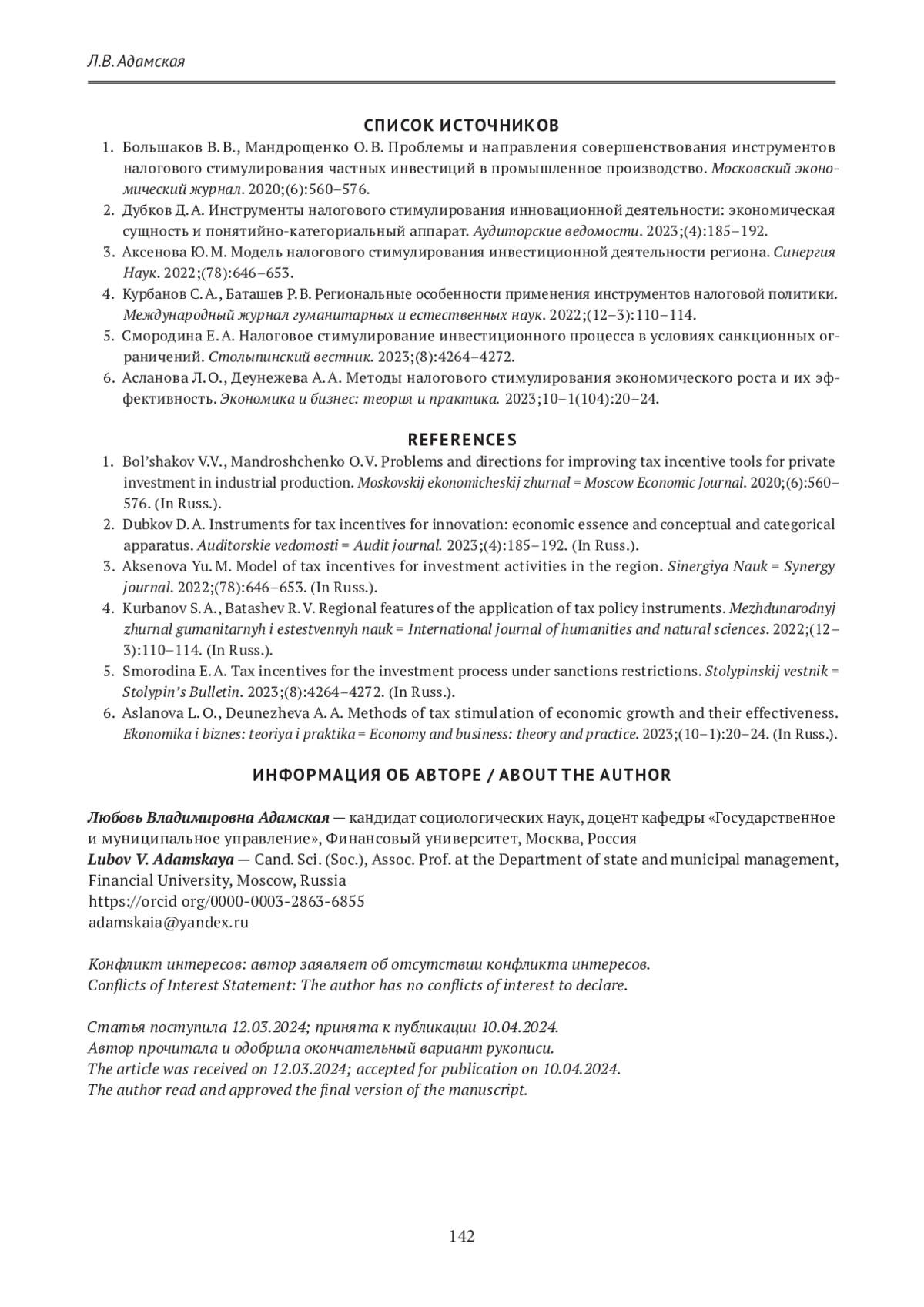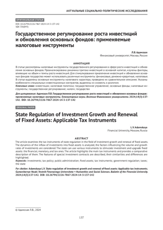 АДАМСКАЯ Л. В. ГОСУДАРСТВЕННОЕ РЕГУЛИРОВАНИЕ РОСТА ИНВЕСТИЦИЙ И ОБНОВЛЕНИЯ ОСНОВНЫХ ФОНДОВ: ПРИМЕНЯЕМЫЕ НАЛОГОВЫЕ ИНСТРУМЕНТЫ // ГУМАНИТАРНЫЕ НАУКИ. ВЕСТНИК ФИНАНСОВОГО УНИВЕРСИТЕТА. 2024. ТОМ 14, № 3