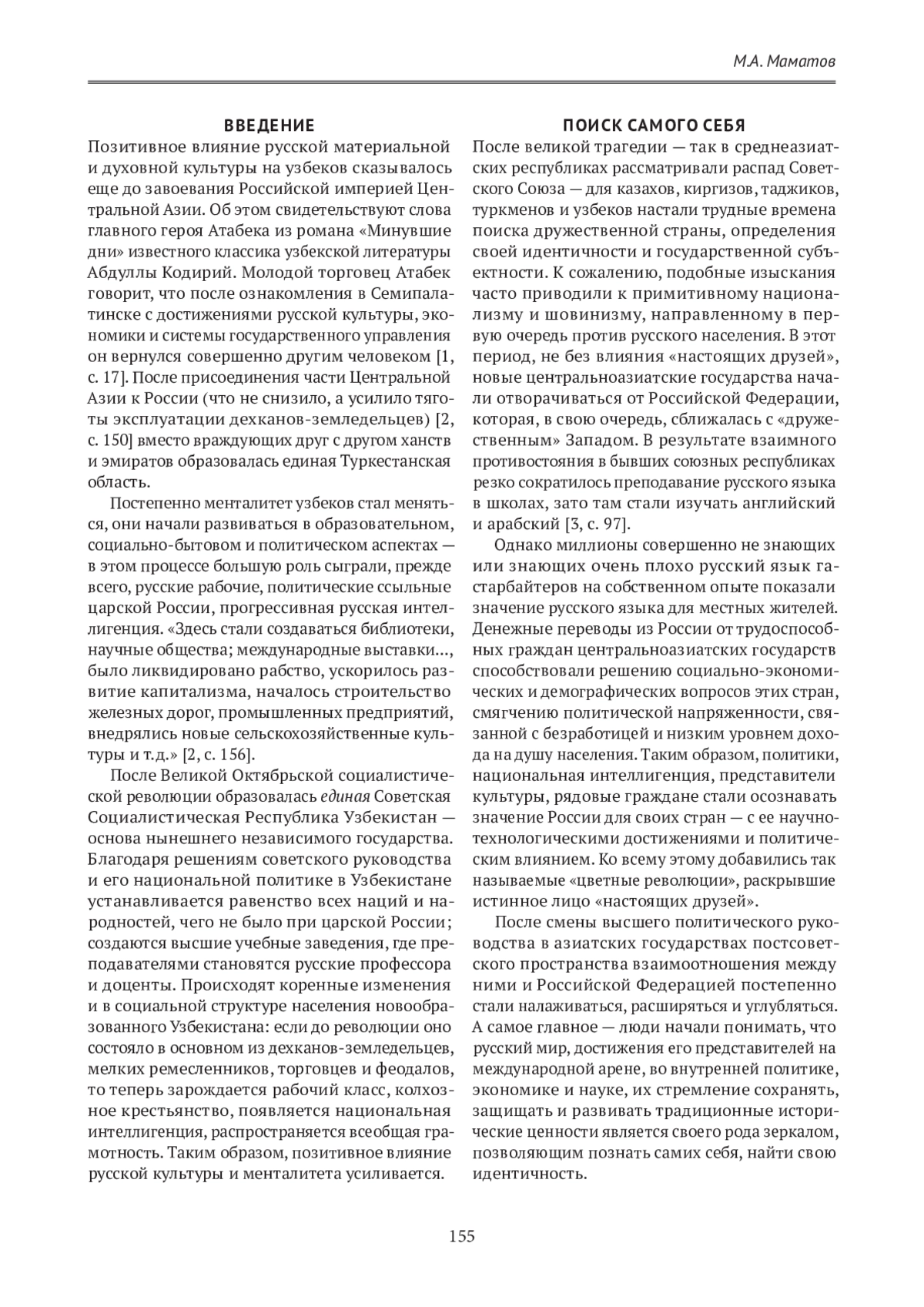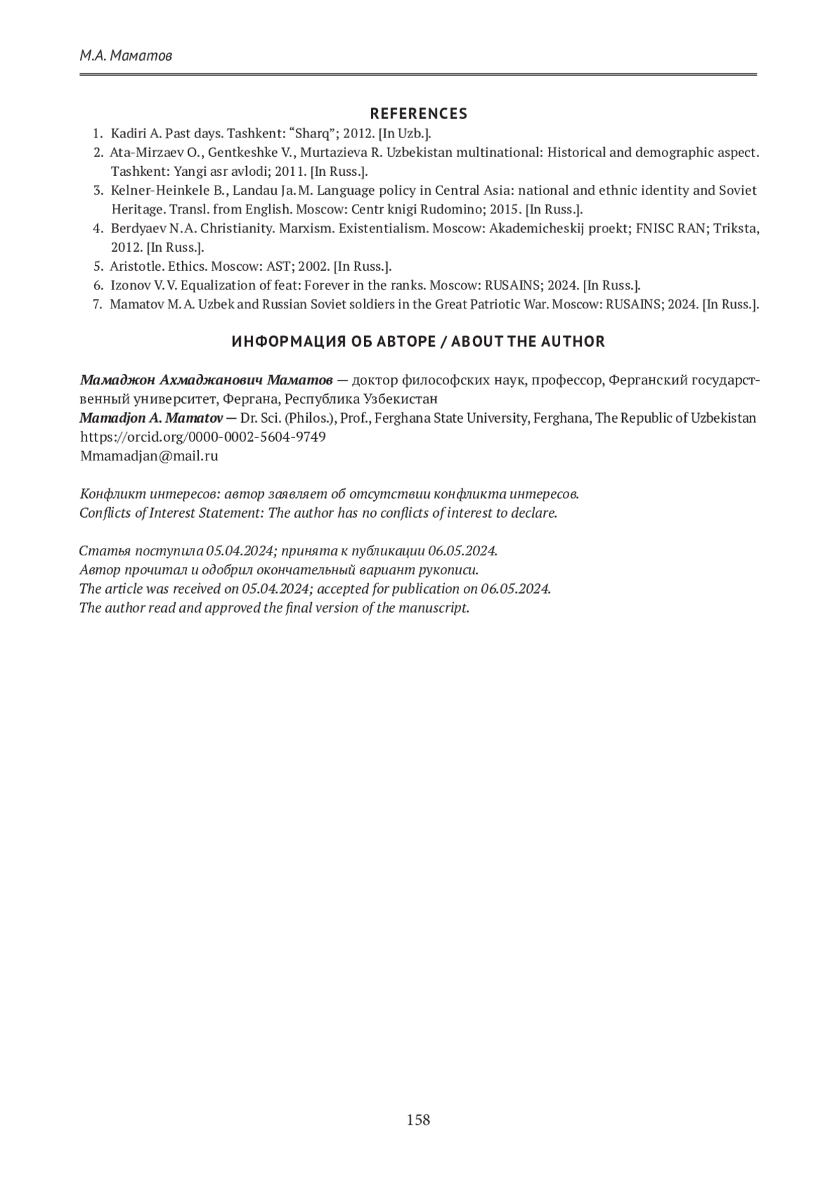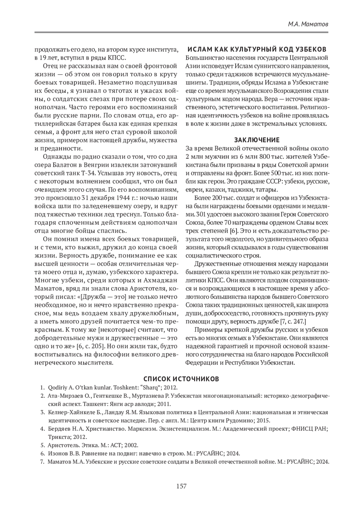 7. Маматов М. А. Узбекские и русские советские солдаты в Великой отечественной войне. М.: РУСАЙНС; 2024.